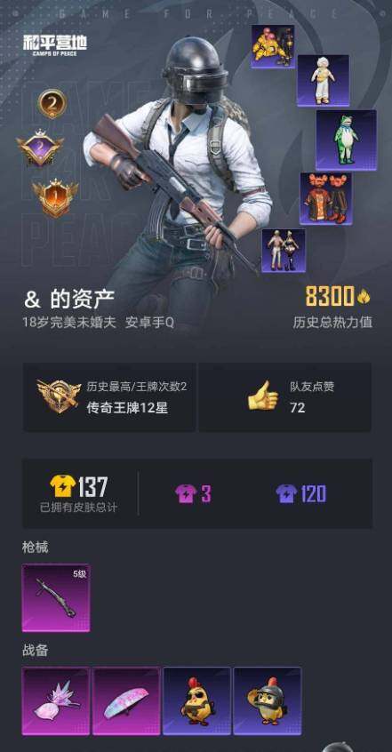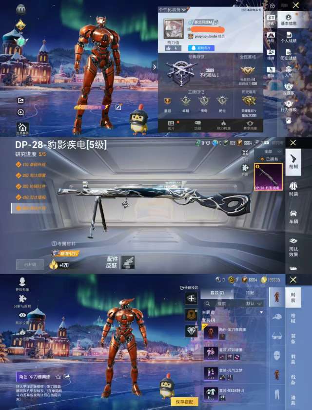 时装数: 18 枪械数: 38 战备数: 30 稀有枪皮:五级DP-28-豹影