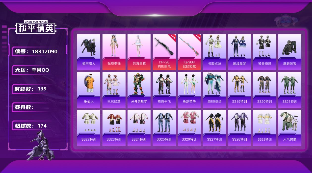 苹果 手Q-0粉装-1特效枪-0载具-0粉色飞行器-9531热力值-2王牌印记