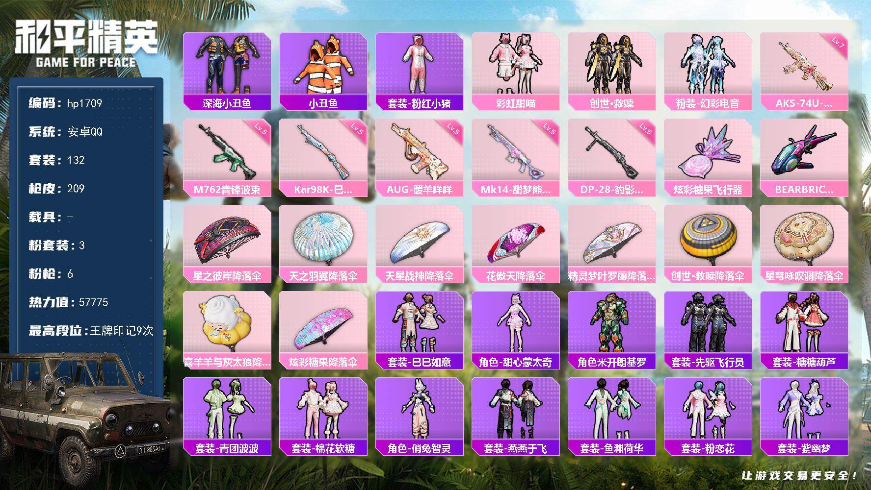 安卓 手Q-3粉装-6特效枪-0载具-2粉色飞行器-57775热力值-9王牌印