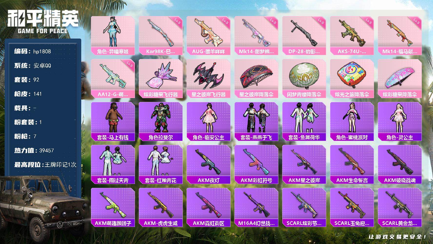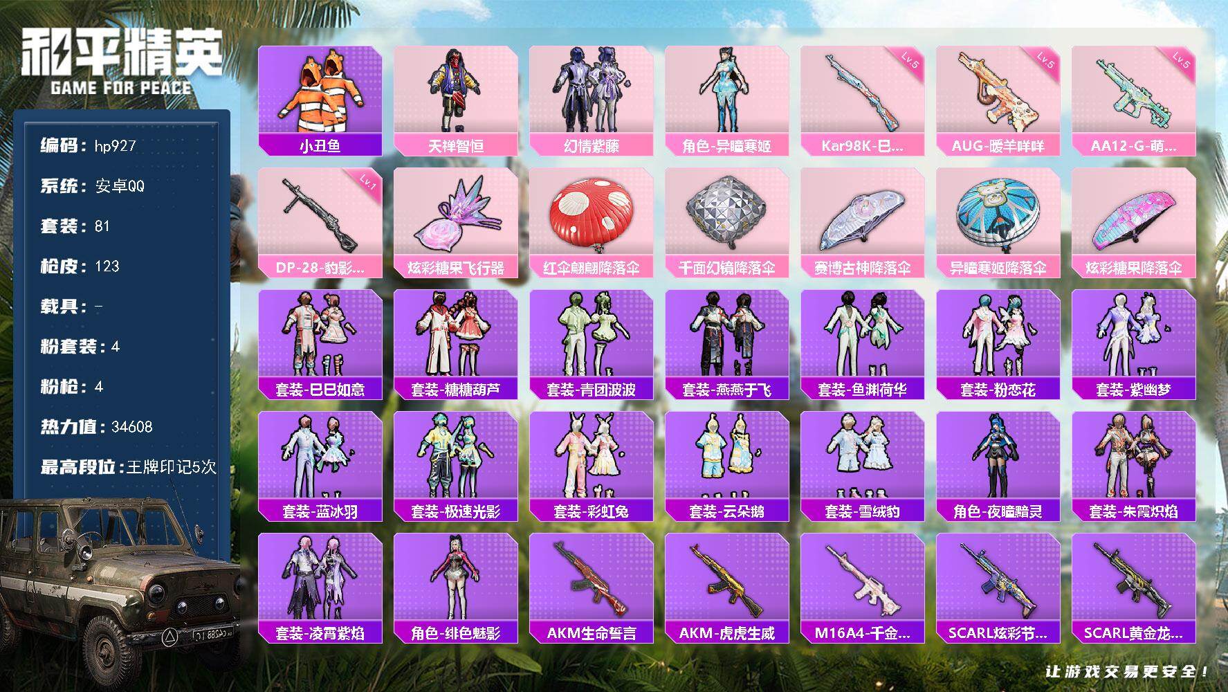 安卓 手Q-4粉装-4特效枪-0载具-1粉色飞行器-34608热力值-5王牌印