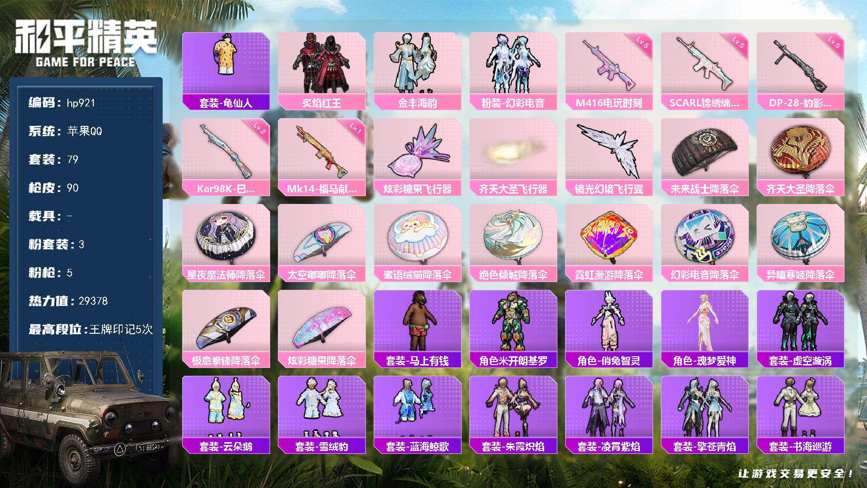 苹果 手Q-3粉装-5特效枪-0载具-3粉色飞行器-29378热力值-5王牌印