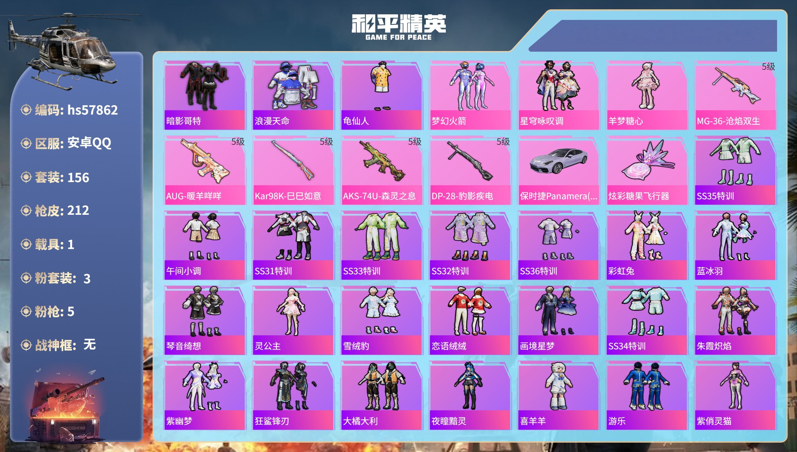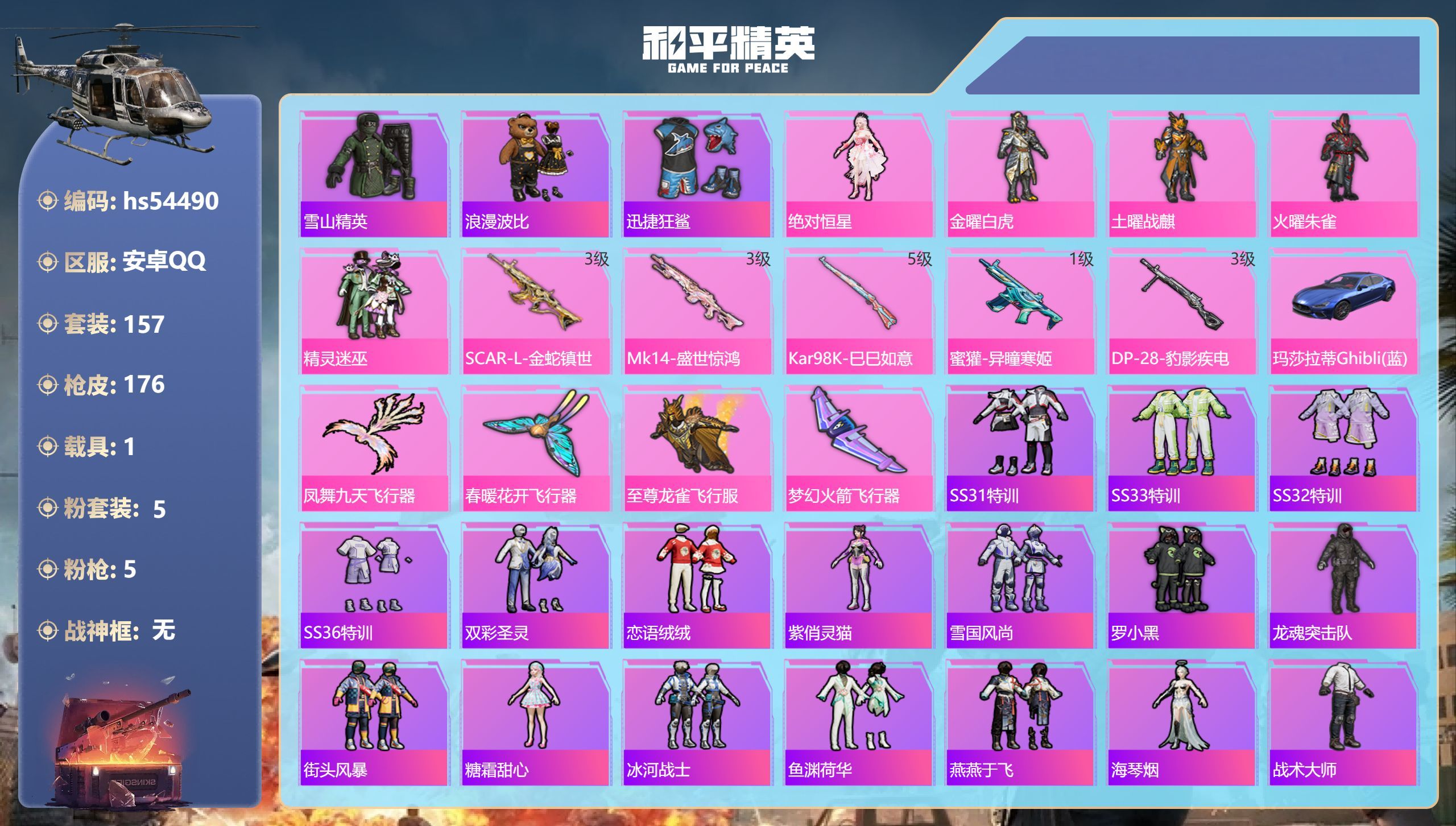 hs54490 安卓手Q-4王牌印记-5粉装-5特效枪-1载具-55734热力值-157套装-176