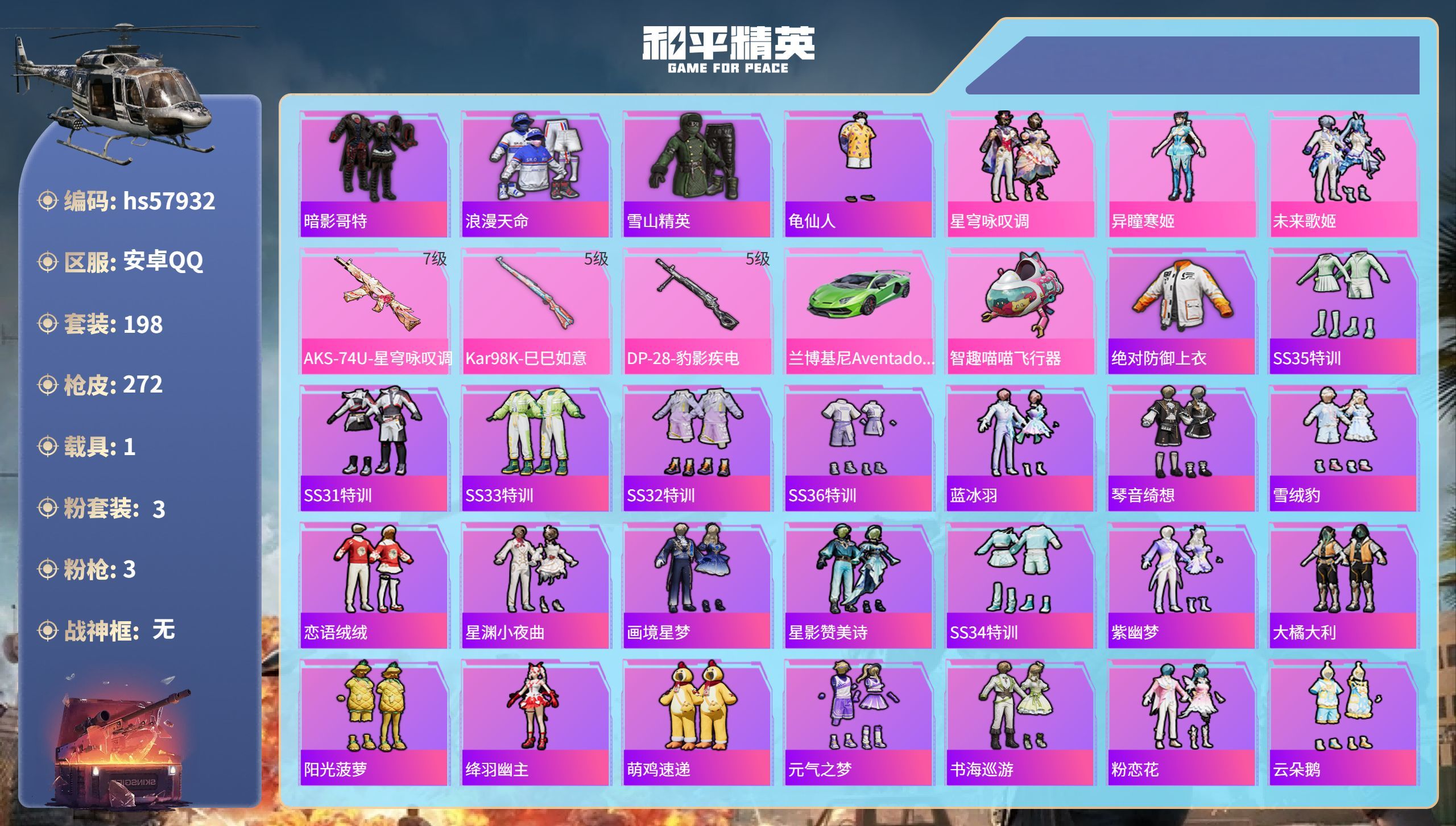 hs57932 安卓手Q-26王牌印记-3粉装-3特效枪-1载具-80685热力值-198套装-27