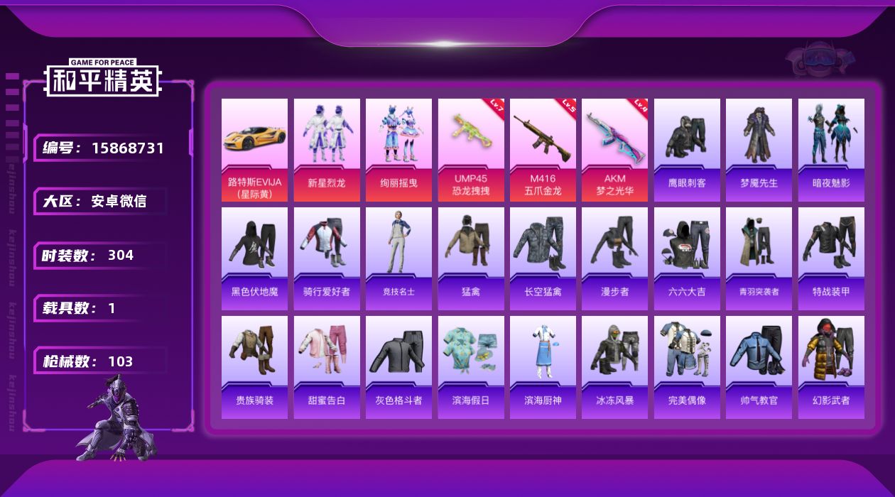 男神号 快乐主宰 古堡领主 AKM-炫紫旋律(七级) MG3-洛神天依(五级)