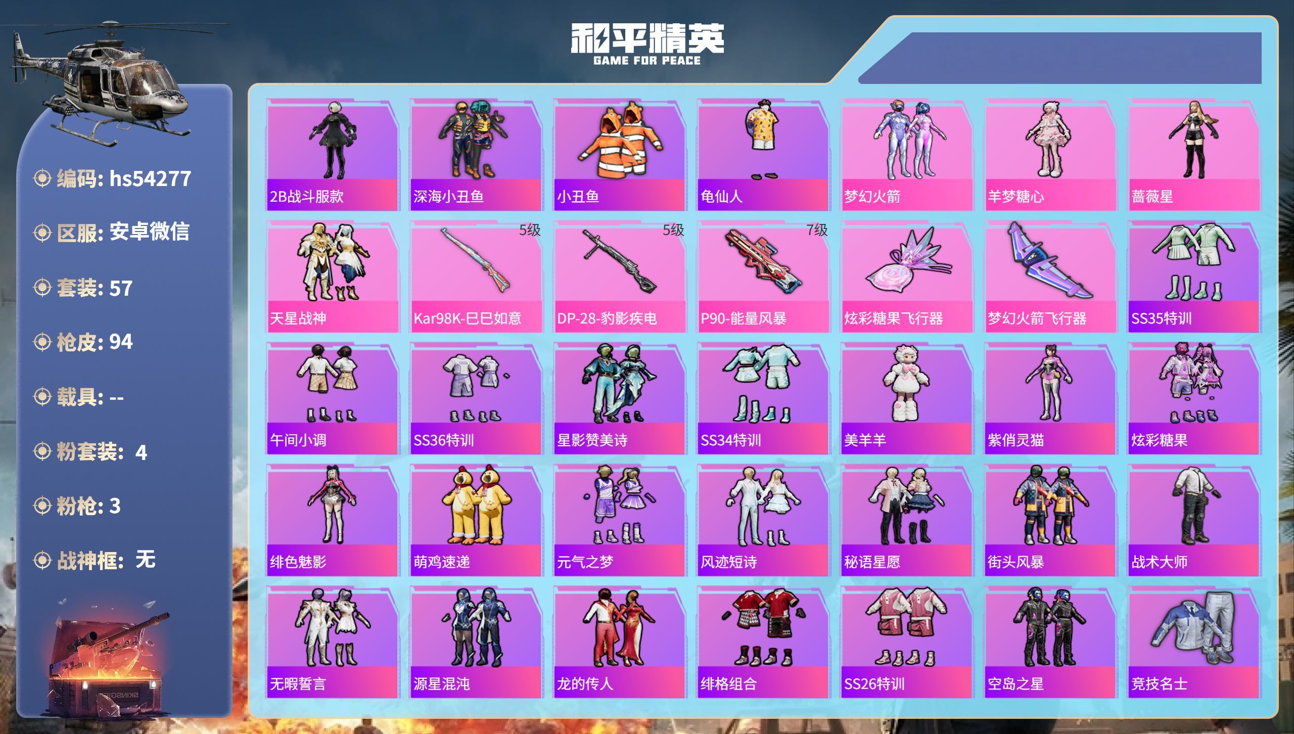 hs54277 安卓v-2王牌印记-4粉装-3特效枪-27217热力值-57套装-94枪皮【4粉装