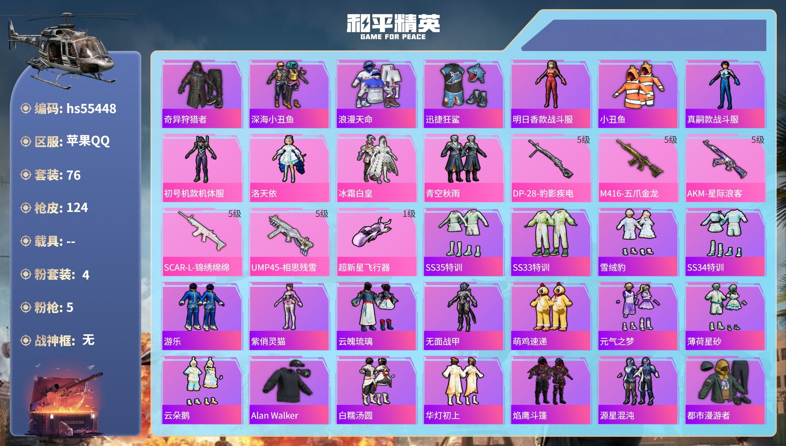 hs55448 苹果手Q-7王牌印记-4粉装-5特效枪-35180热力值-76套装-124枪皮-2卓
