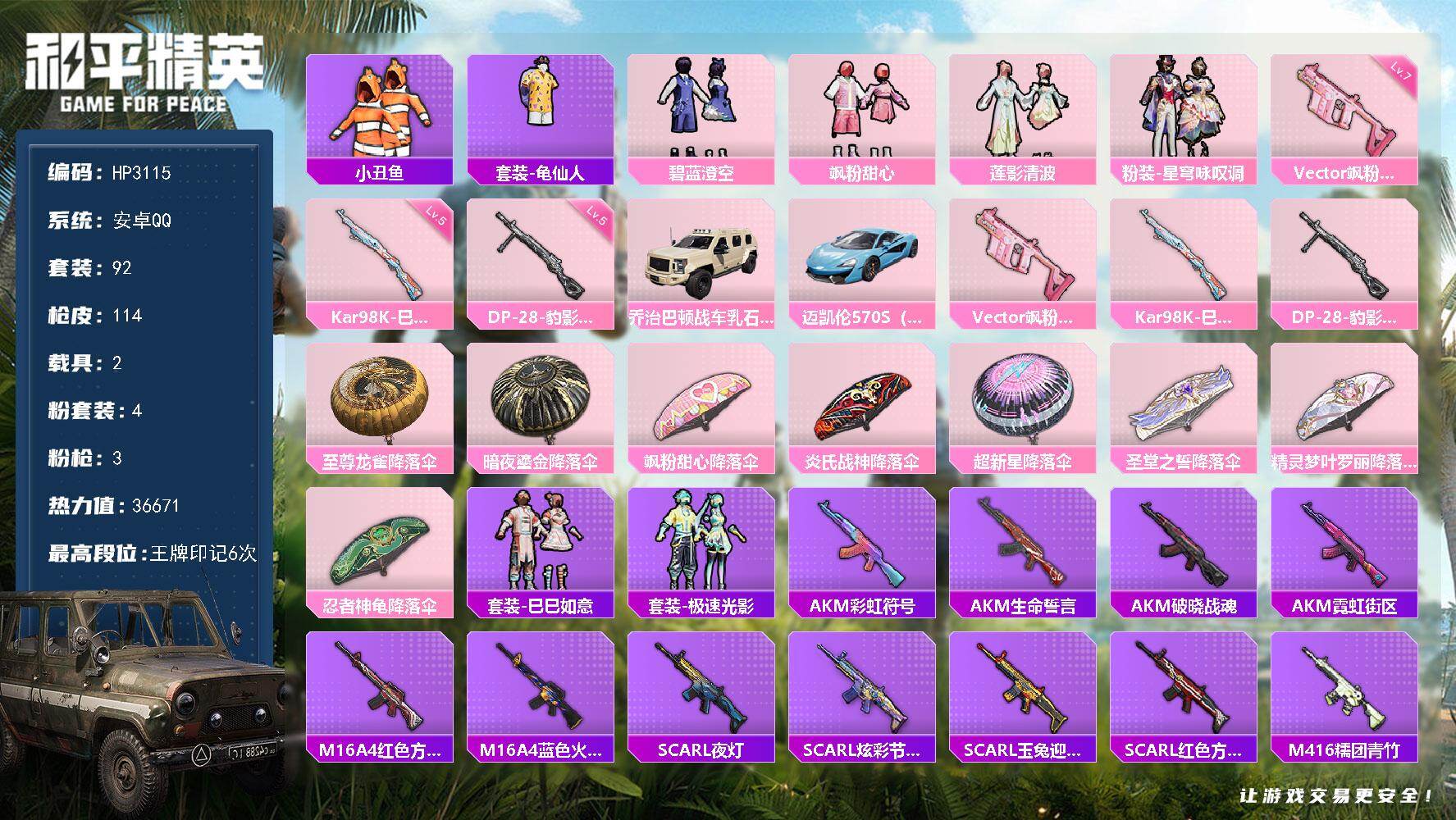 安卓 手Q-4粉装-3特效枪-2载具-0粉色飞行器-36671热力值-6王牌印