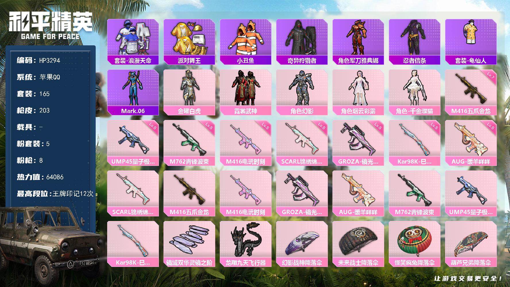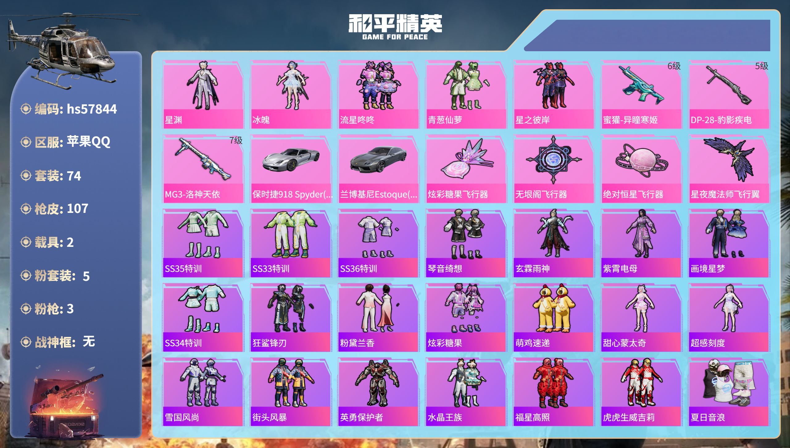 hs57844 苹果手Q-7王牌印记-5粉装-3特效枪-2载具-36046热力值-74套装-107枪