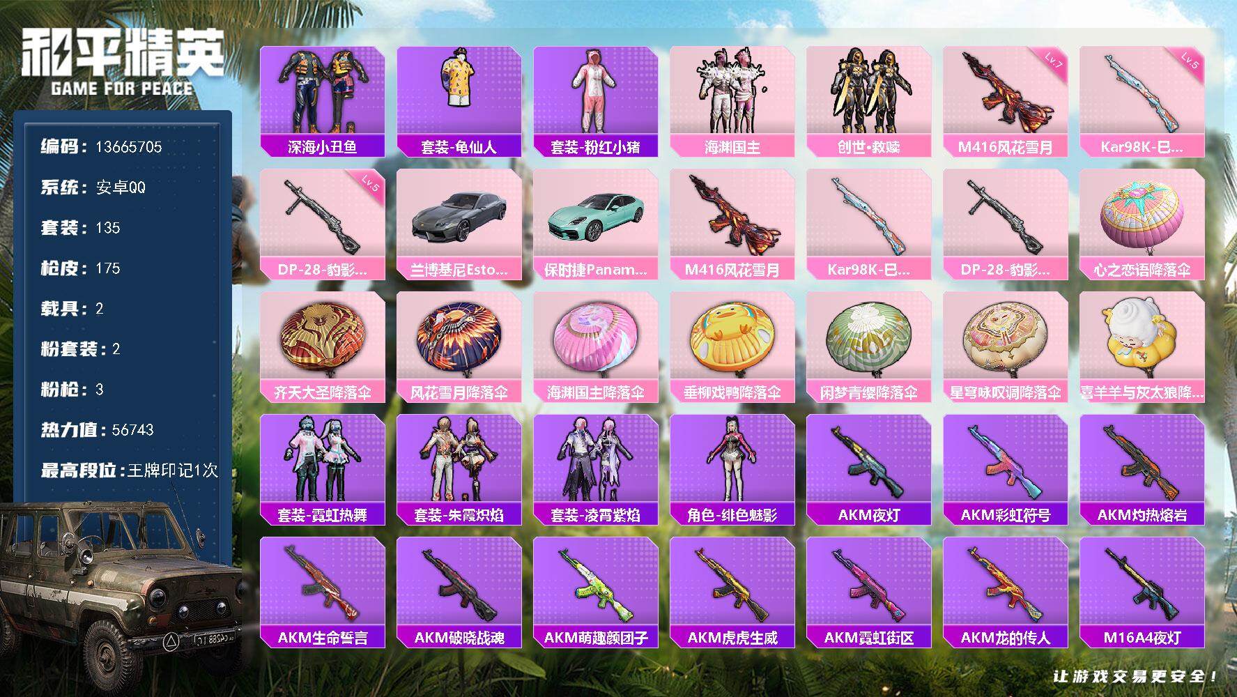 hs46752 安卓手Q-6王牌印记-3粉装-4特效枪-2载具-35317热力值-88套装-97枪皮