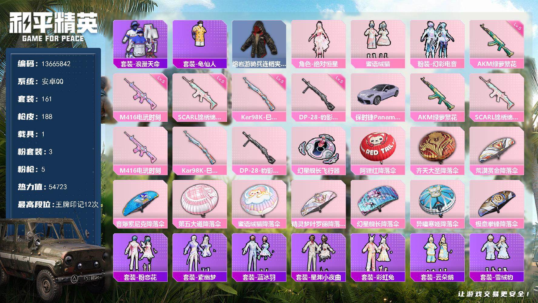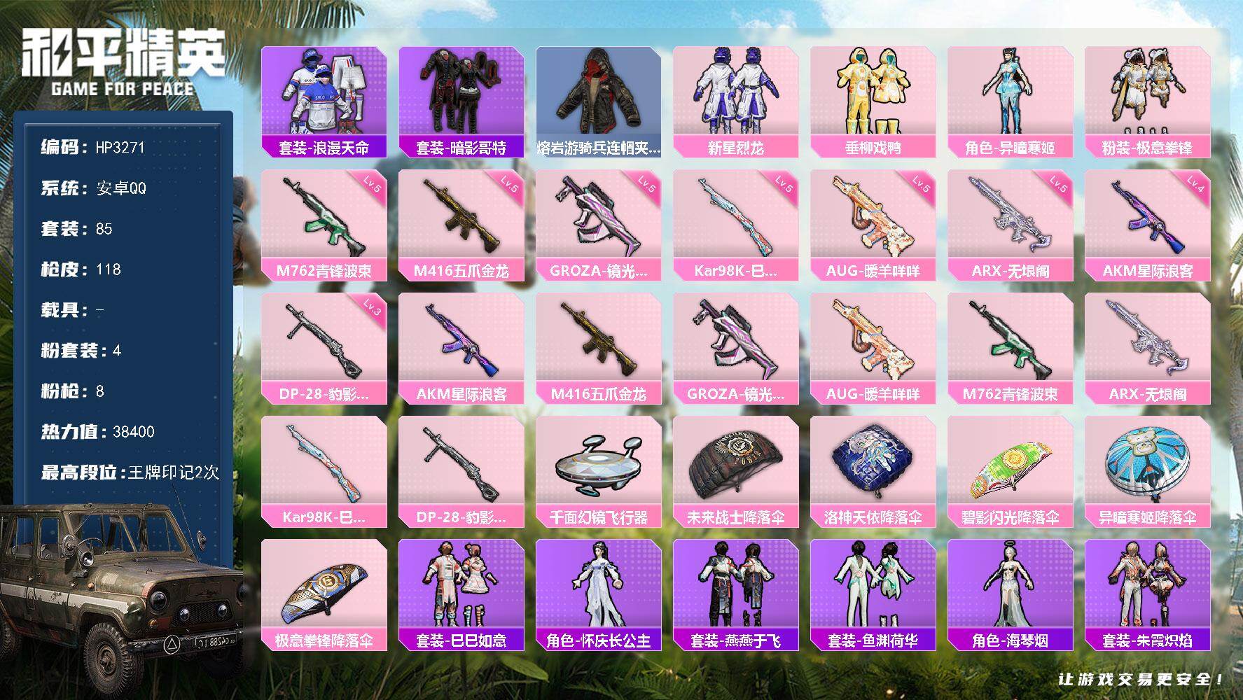 安卓 手Q-4粉装-8特效枪-0载具-1粉色飞行器-38400热力值-2王牌印