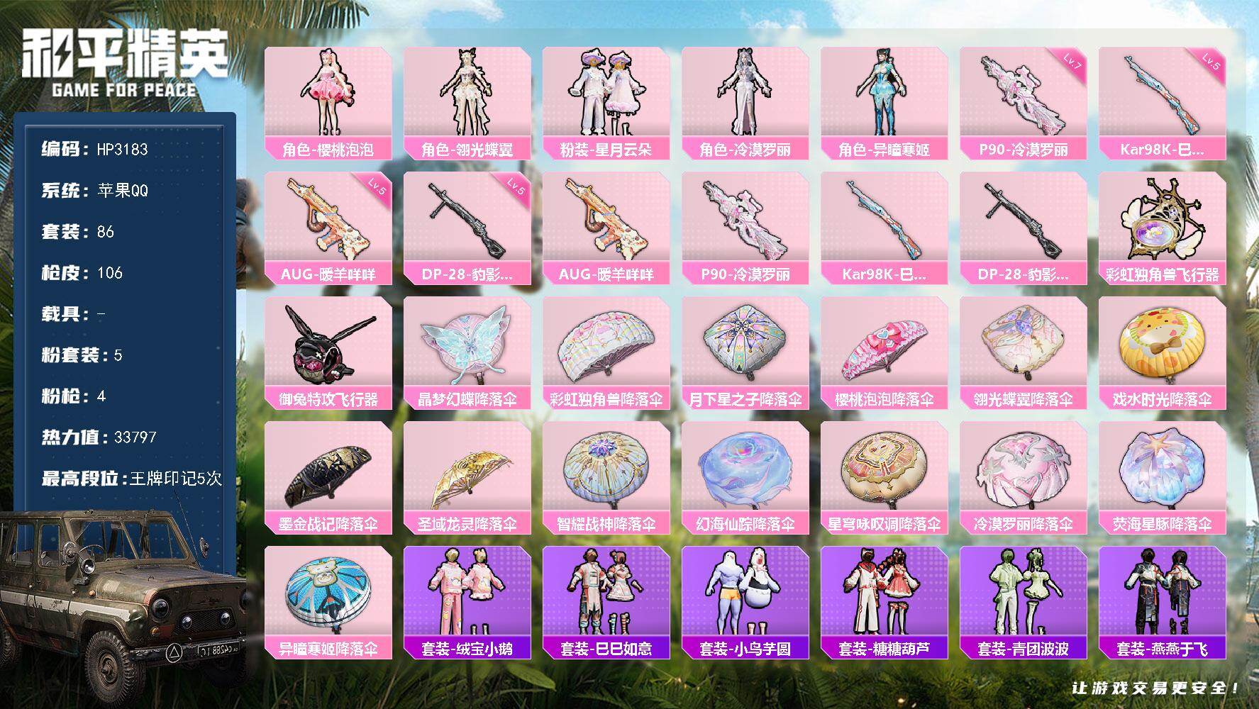 苹果 手Q-5粉装-4特效枪-0载具-3粉色飞行器-33797热力值-5王牌印