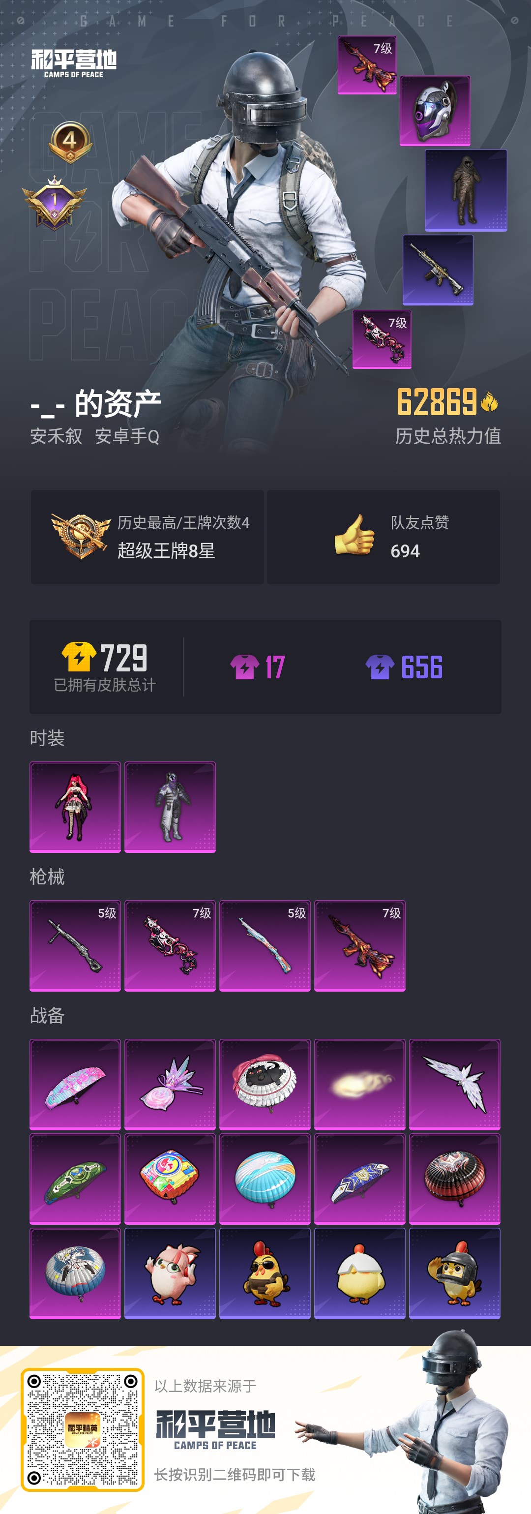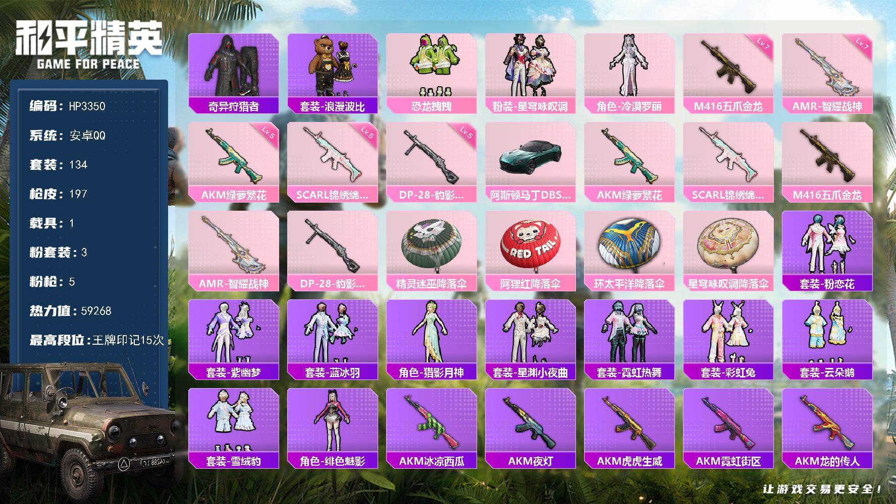安卓 手Q-3粉装-5特效枪-1载具-1粉色飞行器-59268热力值-15王牌