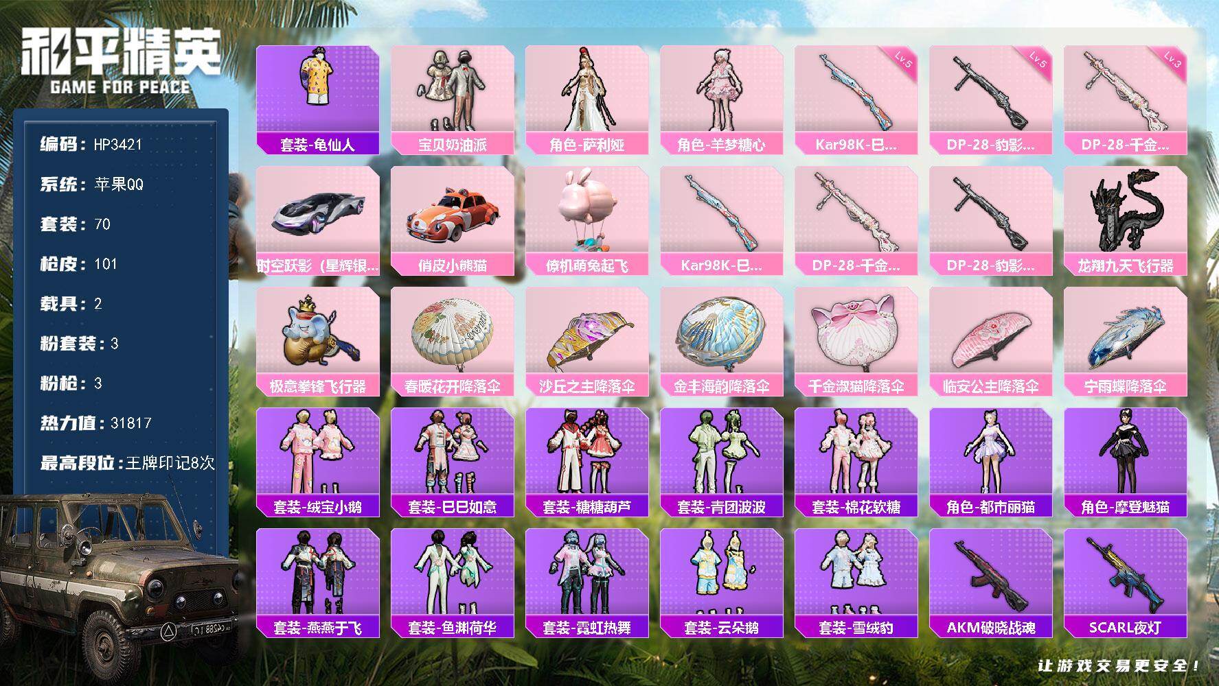 苹果 手Q-3粉装-3特效枪-2载具-3粉色飞行器-31817热力值-8王牌印