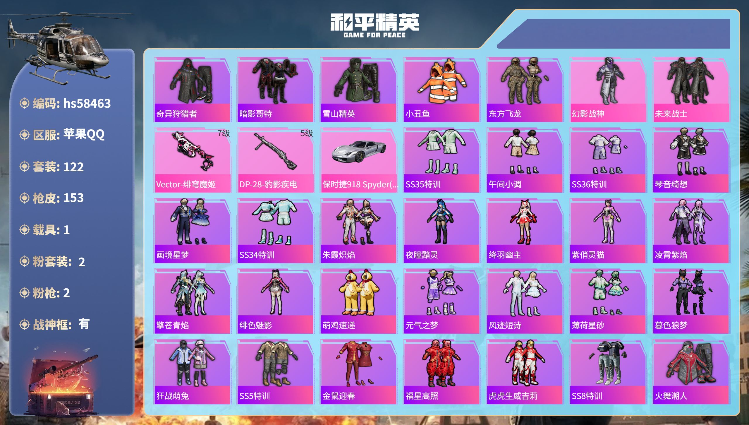 hs58463 苹果手Q-12王牌印记-有战神框-2粉装-2特效枪-1载具-43698热力值-122