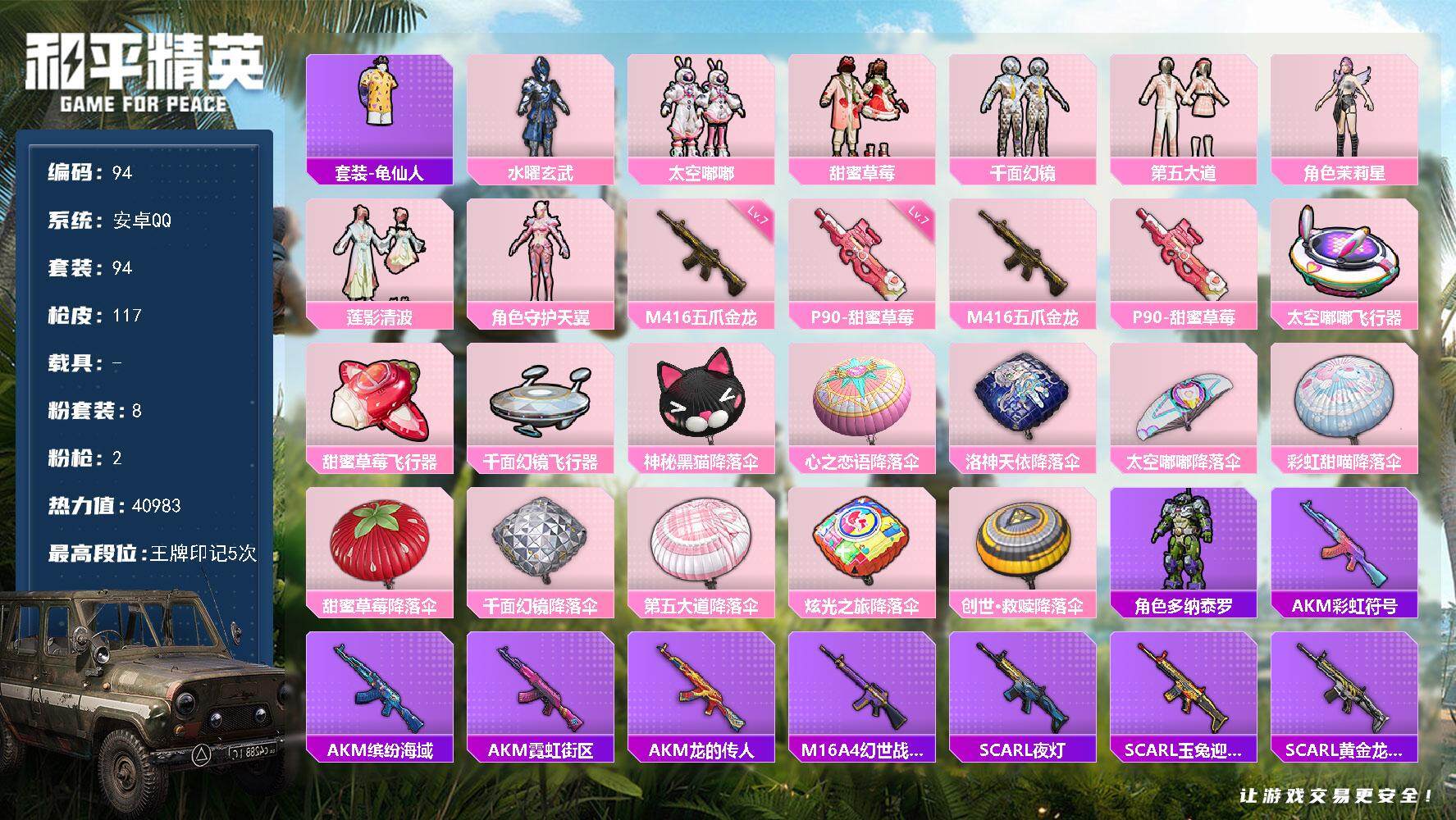 安卓 手Q-8粉装-2特效枪-0载具-3粉色飞行器-40983热力值-5王牌印