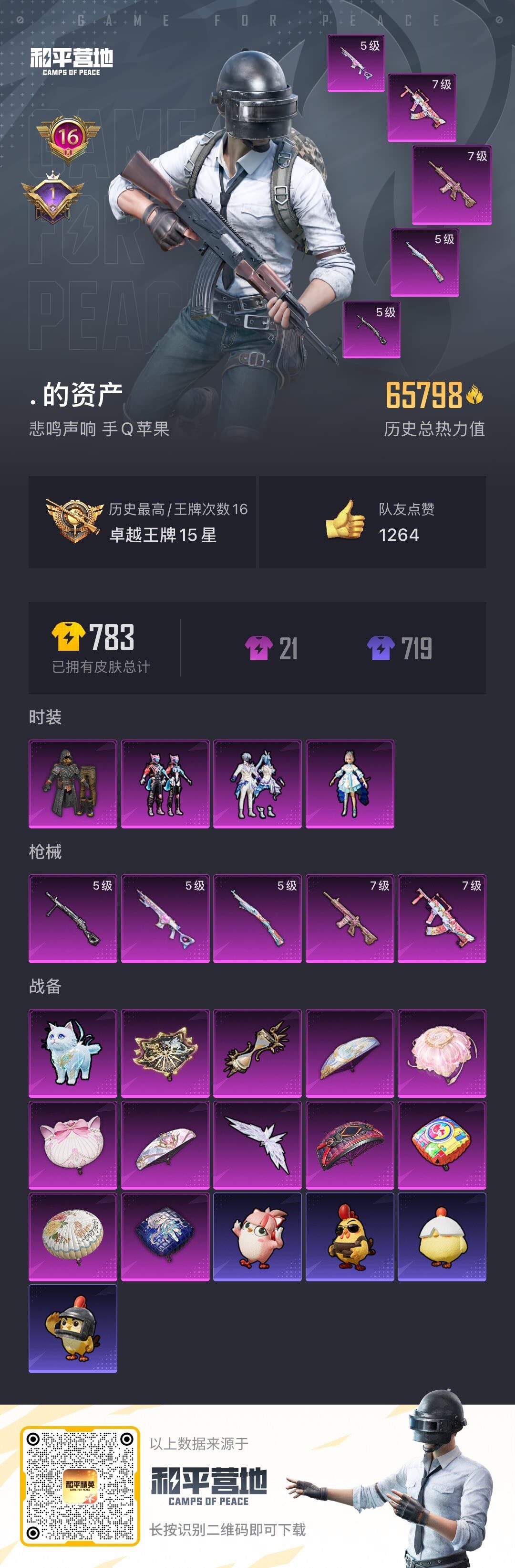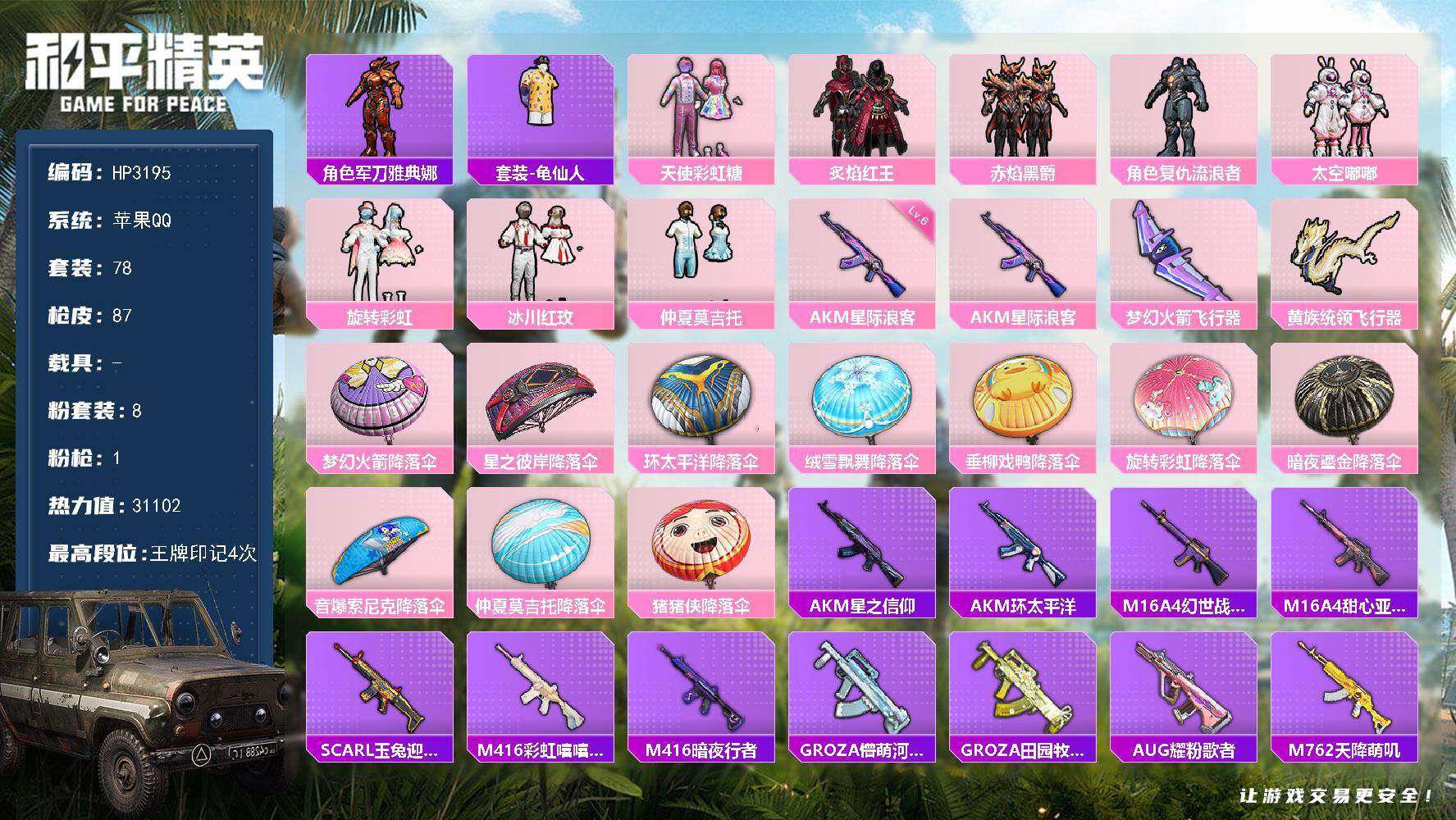 苹果 手Q-4粉装-5特效枪-0载具-3粉色飞行器-65798热力值-16王牌