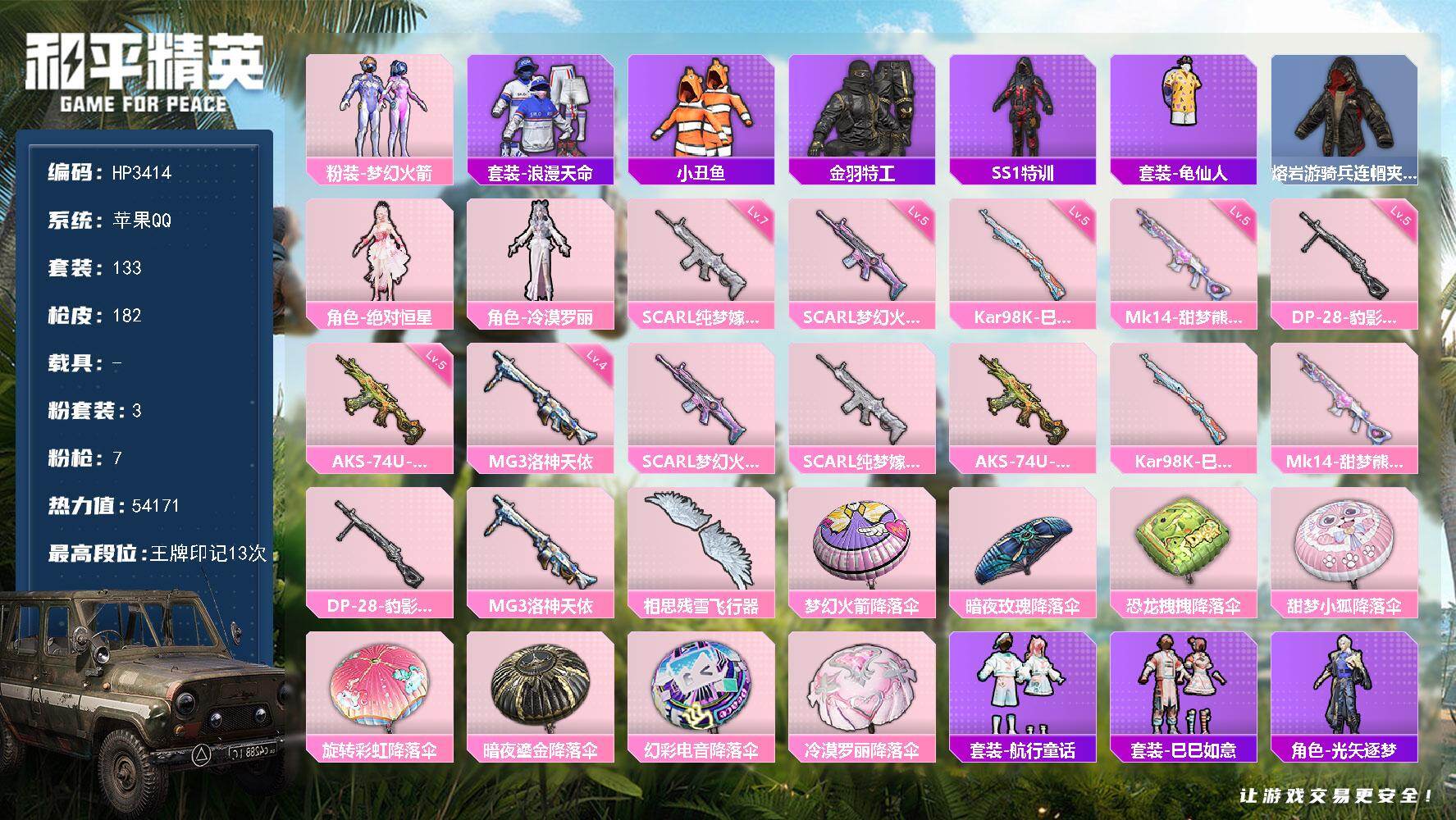 苹果 手Q-3粉装-7特效枪-0载具-1粉色飞行器-54171热力值-13王牌