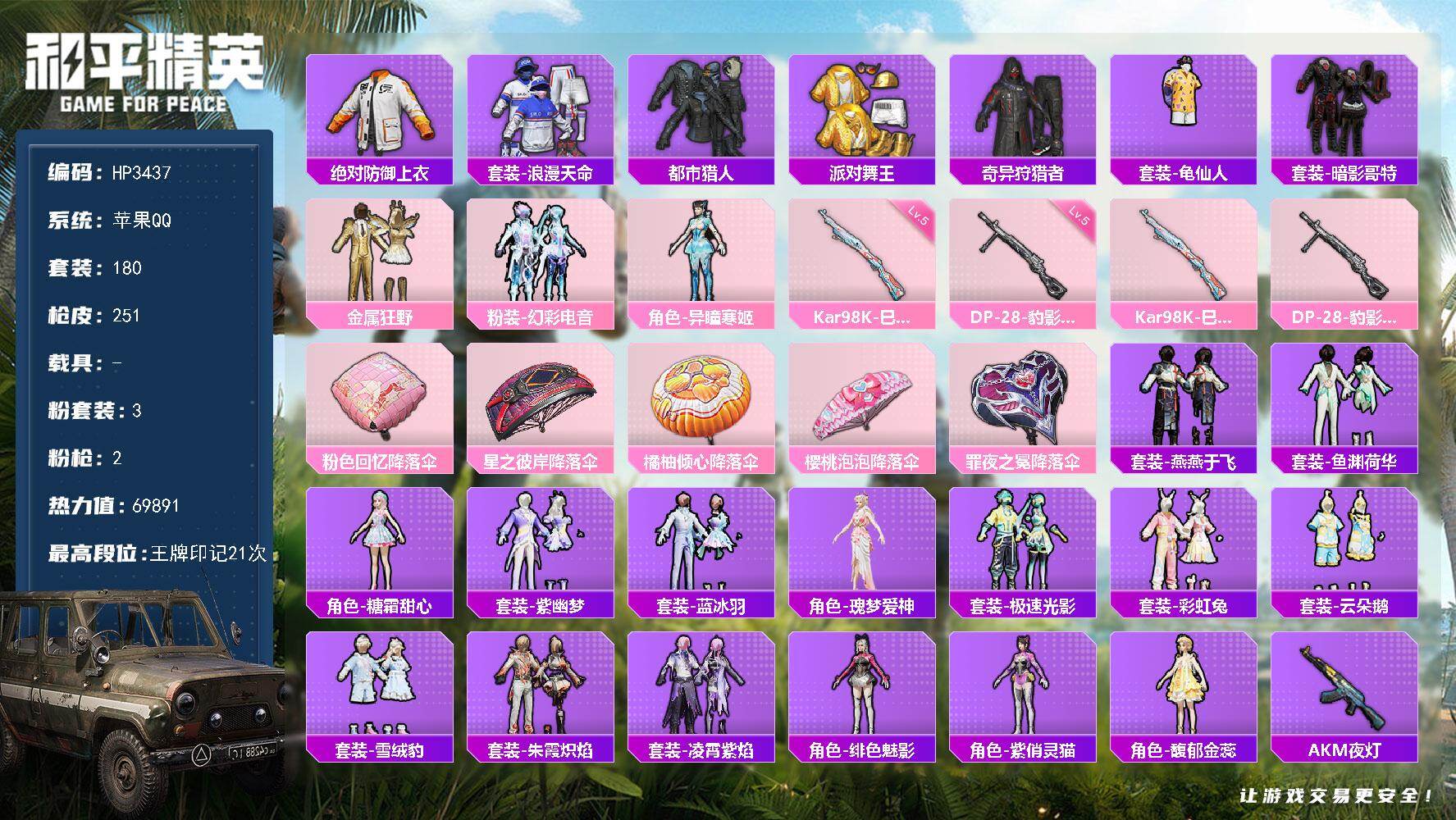 苹果 手Q-3粉装-2特效枪-0载具-1粉色飞行器-69891热力值-21王牌