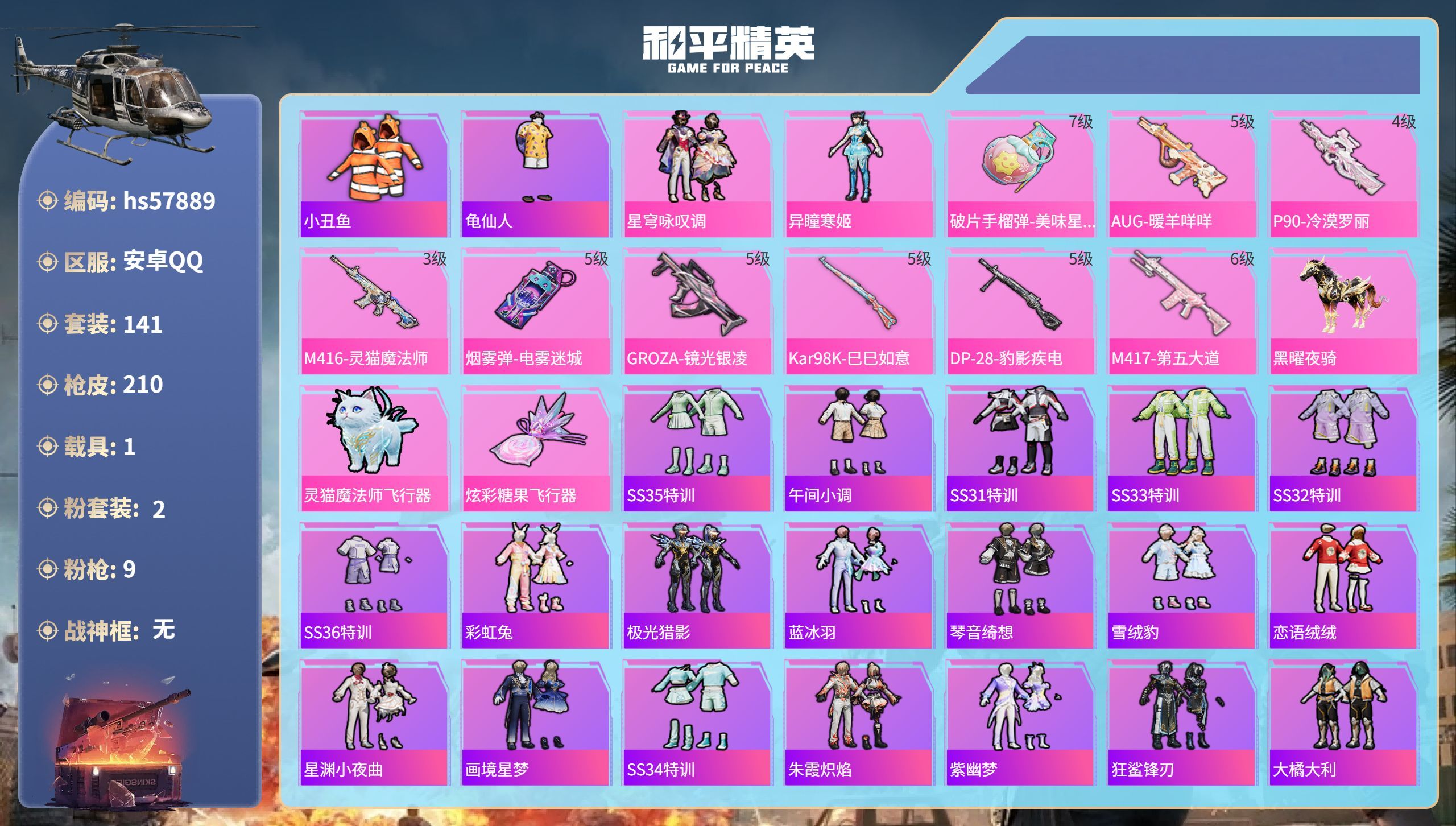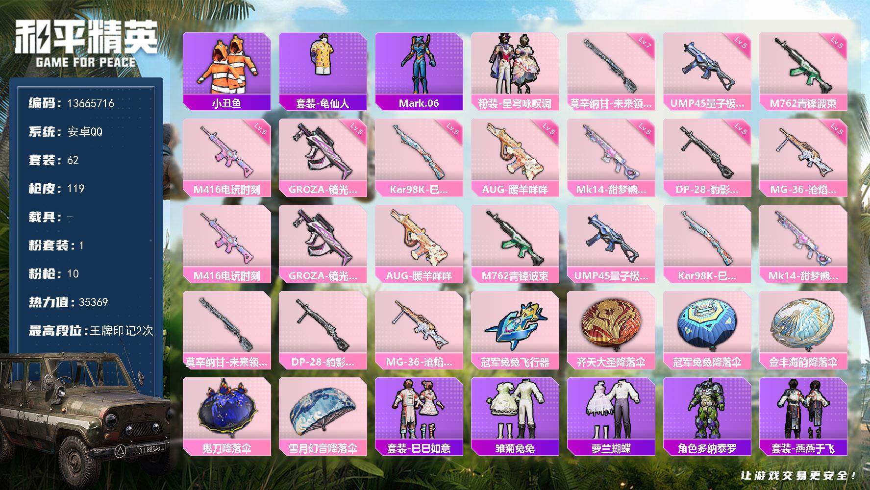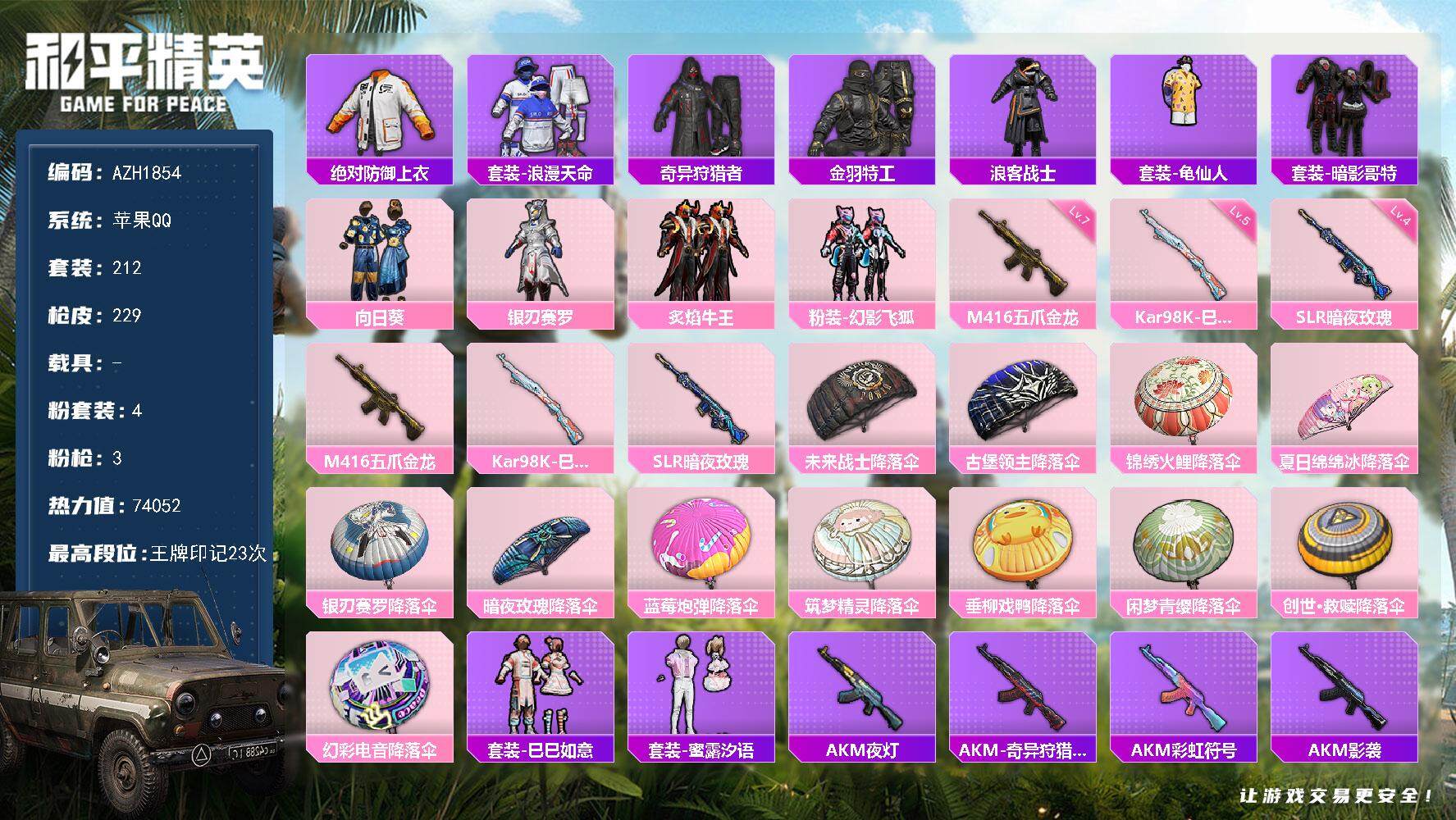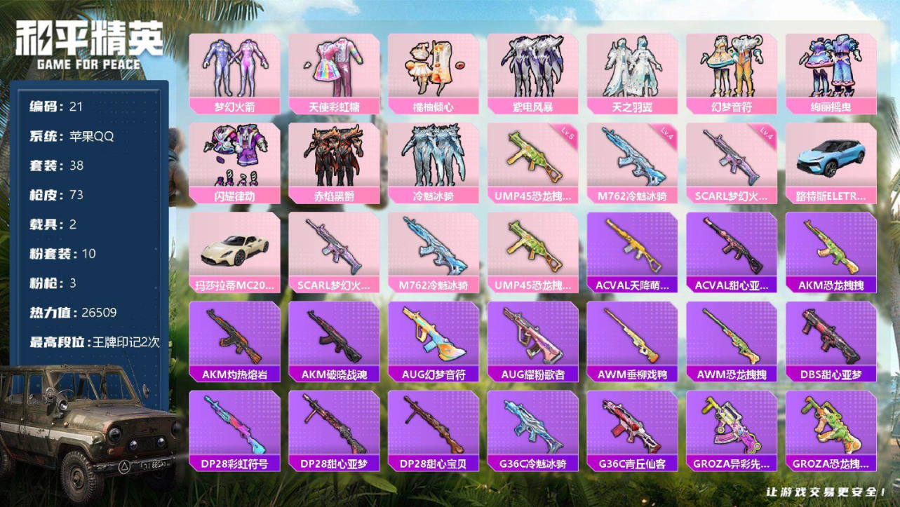 a4119/苹果QQ/-5王牌印记-2粉装-9特效枪-1载具-31285热力值-58套装-98枪皮-