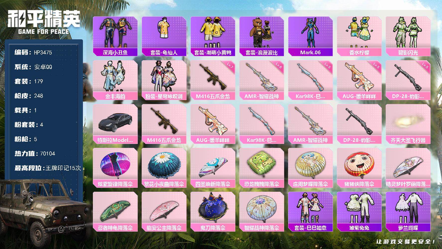 安卓 手Q-4粉装-5特效枪-1载具-1粉色飞行器-70104热力值-15王牌