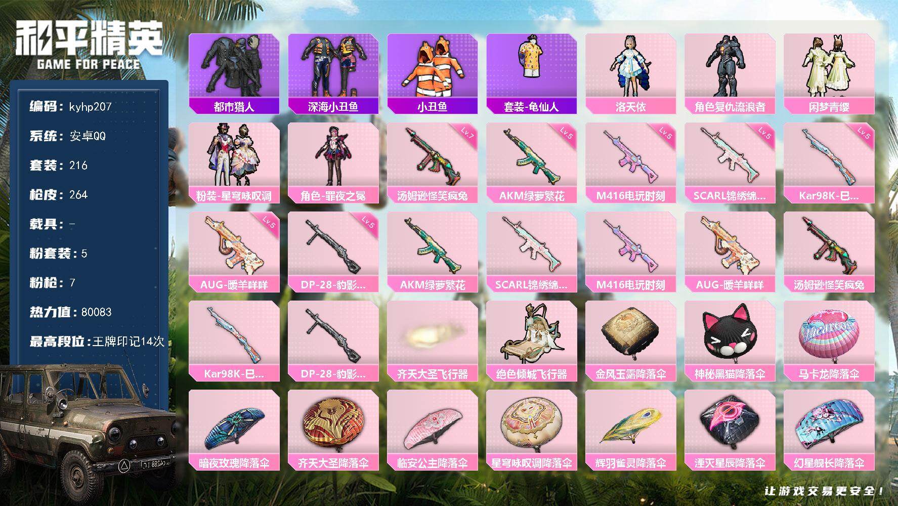 安卓 手Q-5粉装-7特效枪-0载具-2粉色飞行器-80083热力值-14王牌