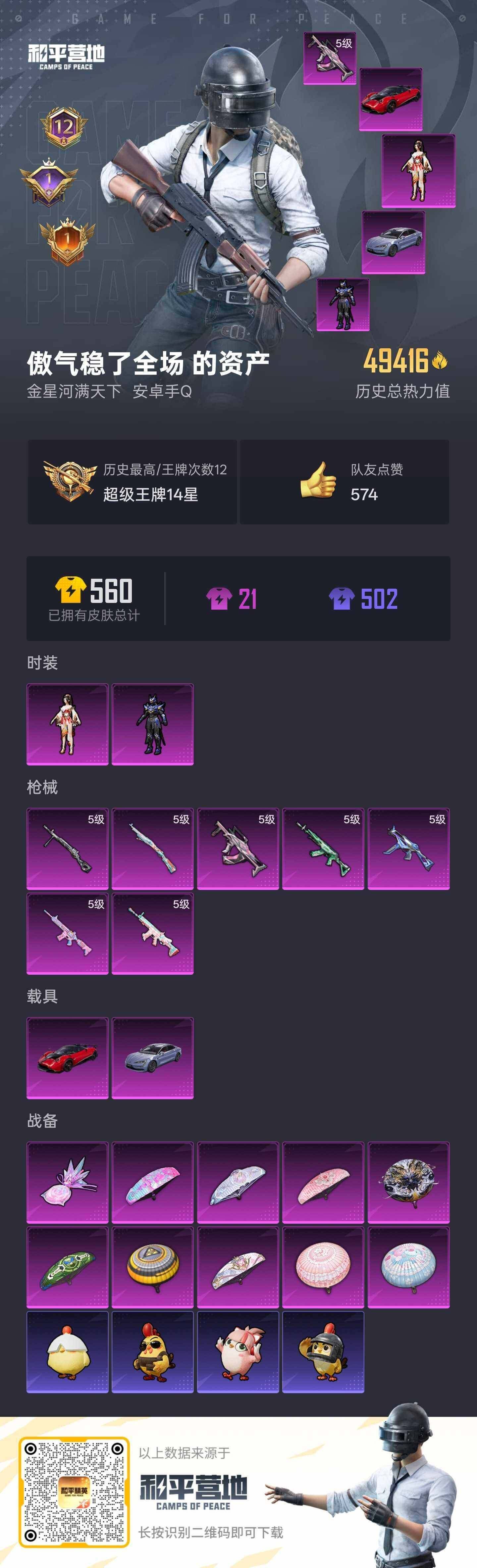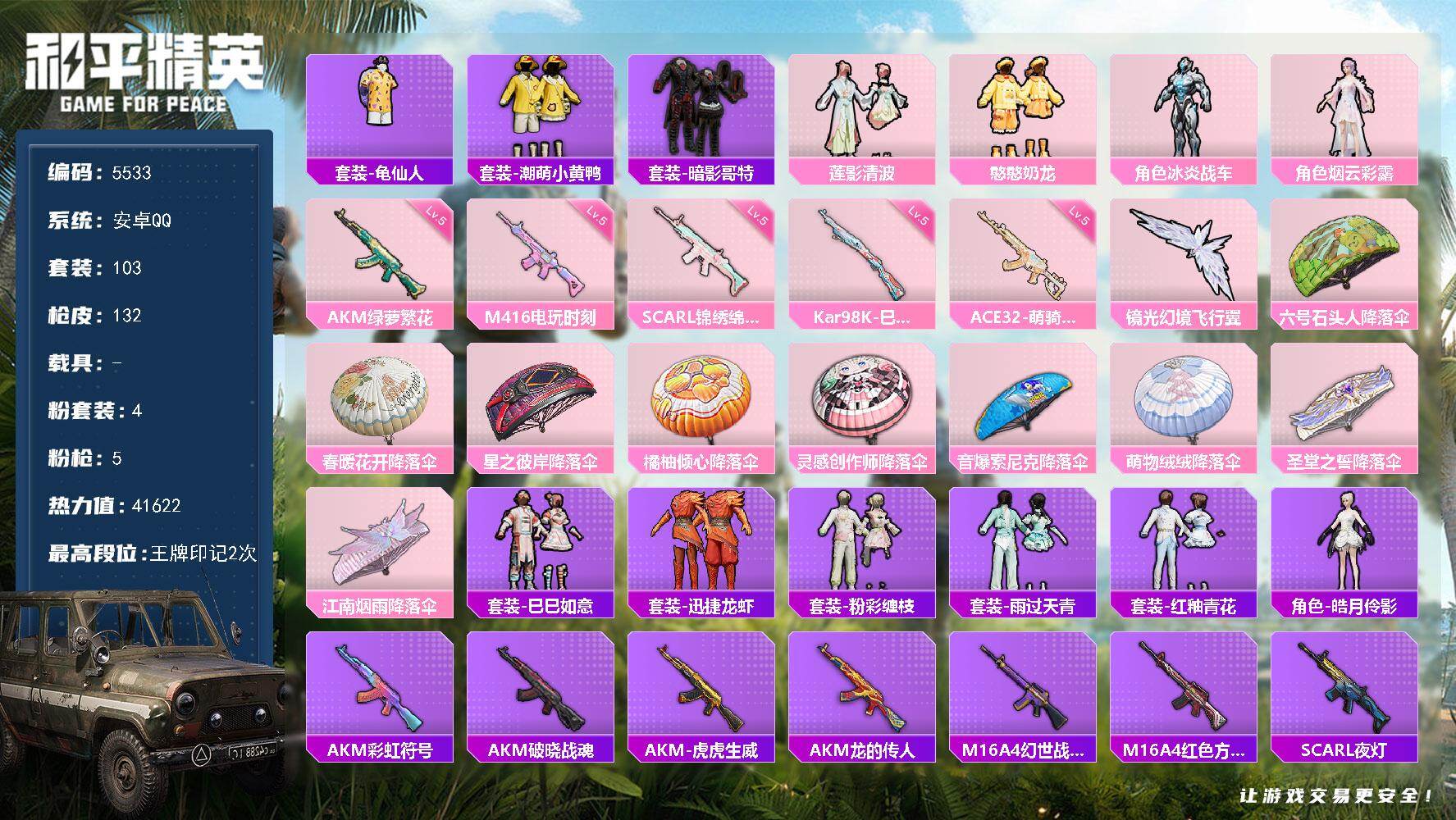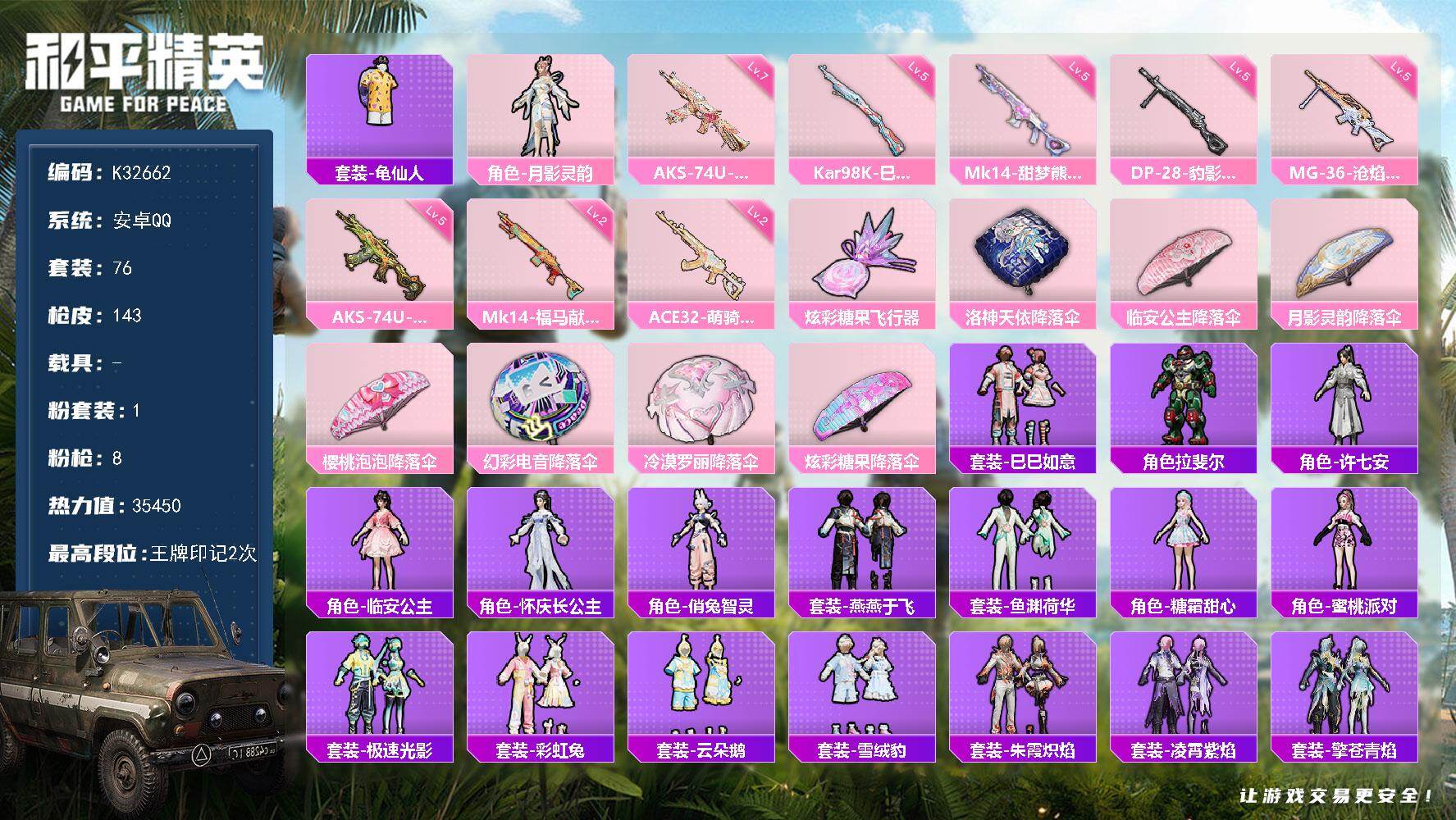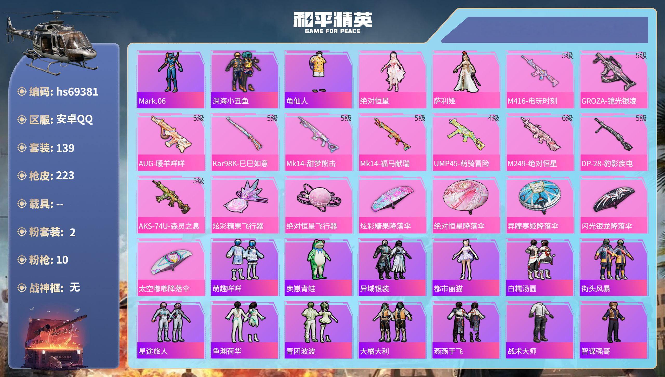 安卓 手Q-4粉装-4特效枪-0载具-1粉色飞行器-34608热力值-5王牌印记