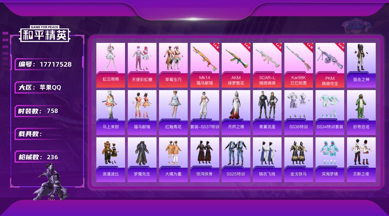 3粉装-4特效枪-1载具-1粉色飞行器-45401热力值-2王牌印记-104套装-158枪皮