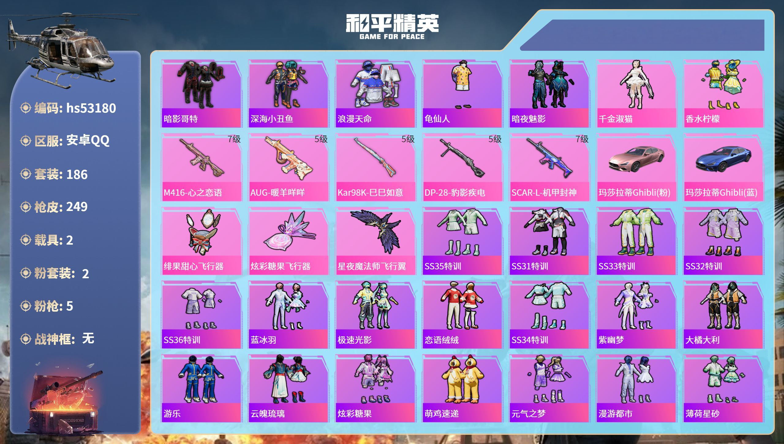 hs53180 安卓手Q-15王牌印记-2粉装-5特效枪-2载具-77097热力值-186套装-24