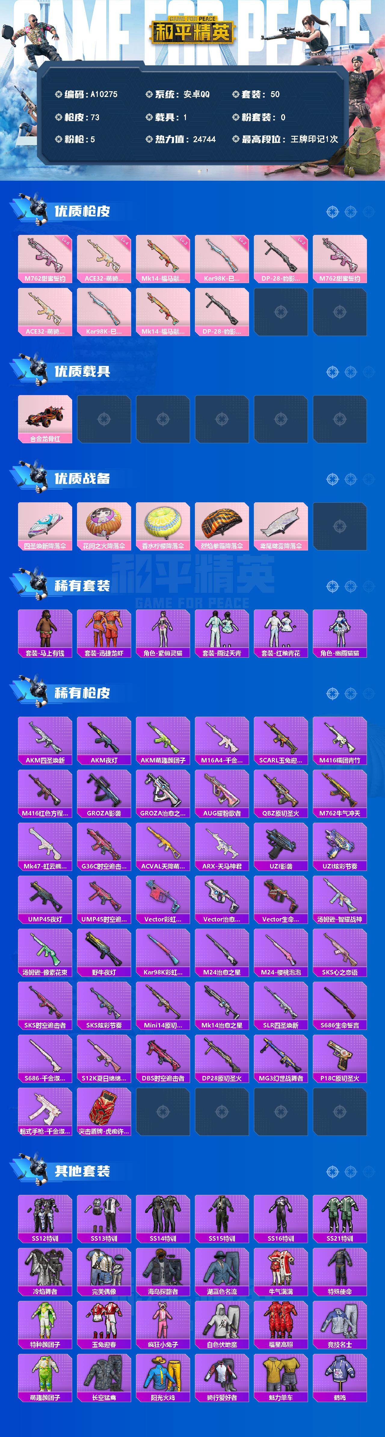 0粉装-5特效枪-1载具-0粉色飞行器-24744热力值-1王牌印记-50套装-73枪皮