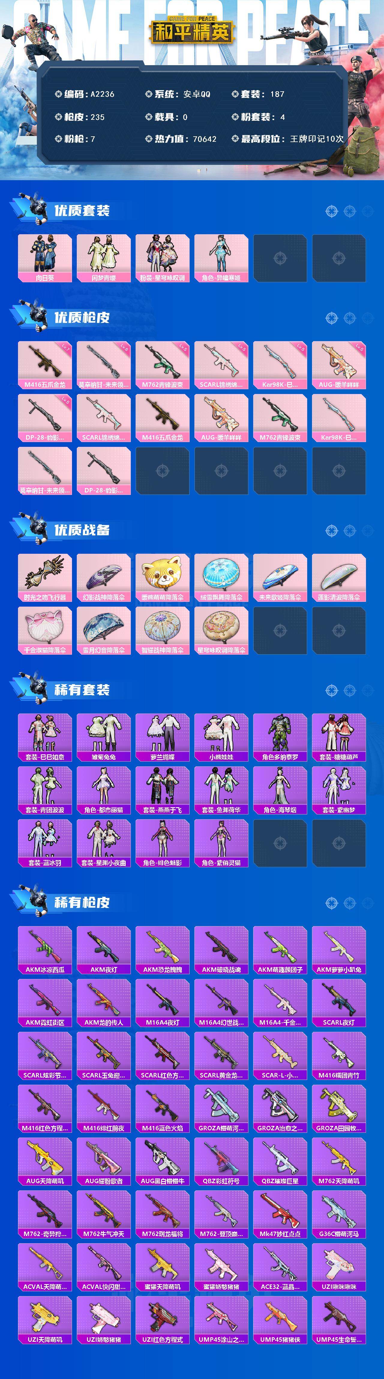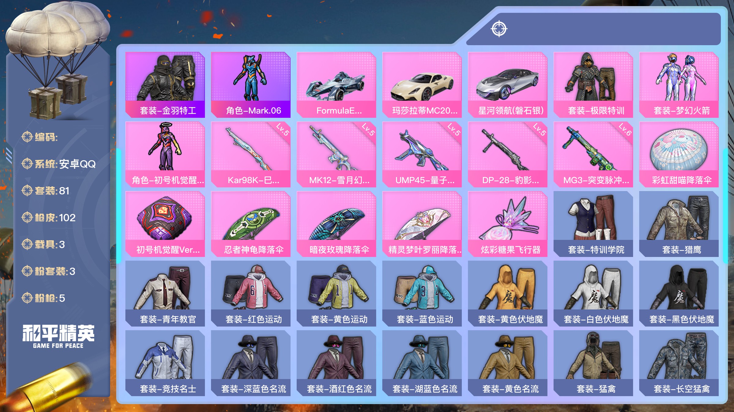 安卓Q-3载具5粉装1特效枪4热门71套装104枪皮 34270热力值 4印记 历史超级王牌13星