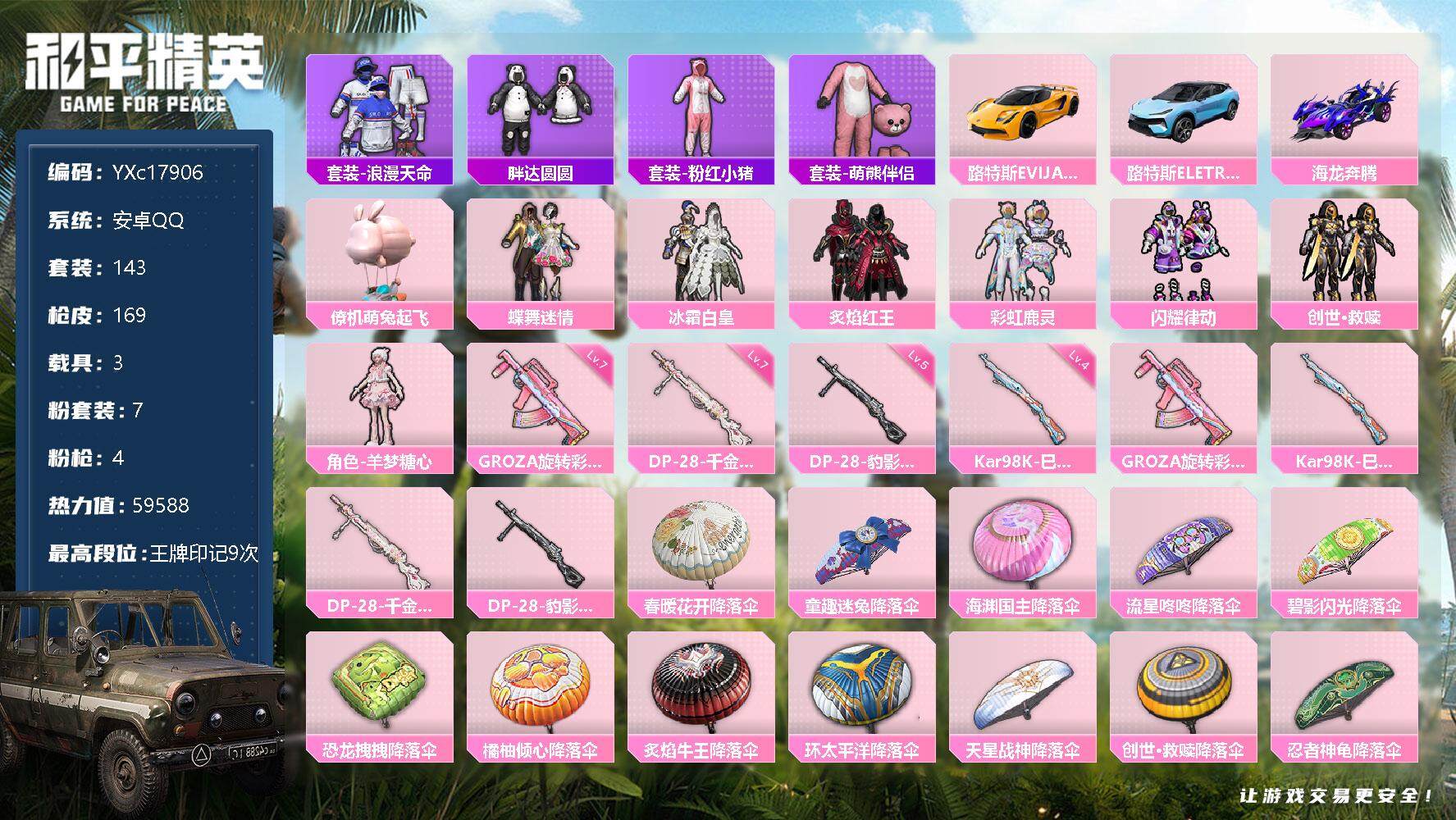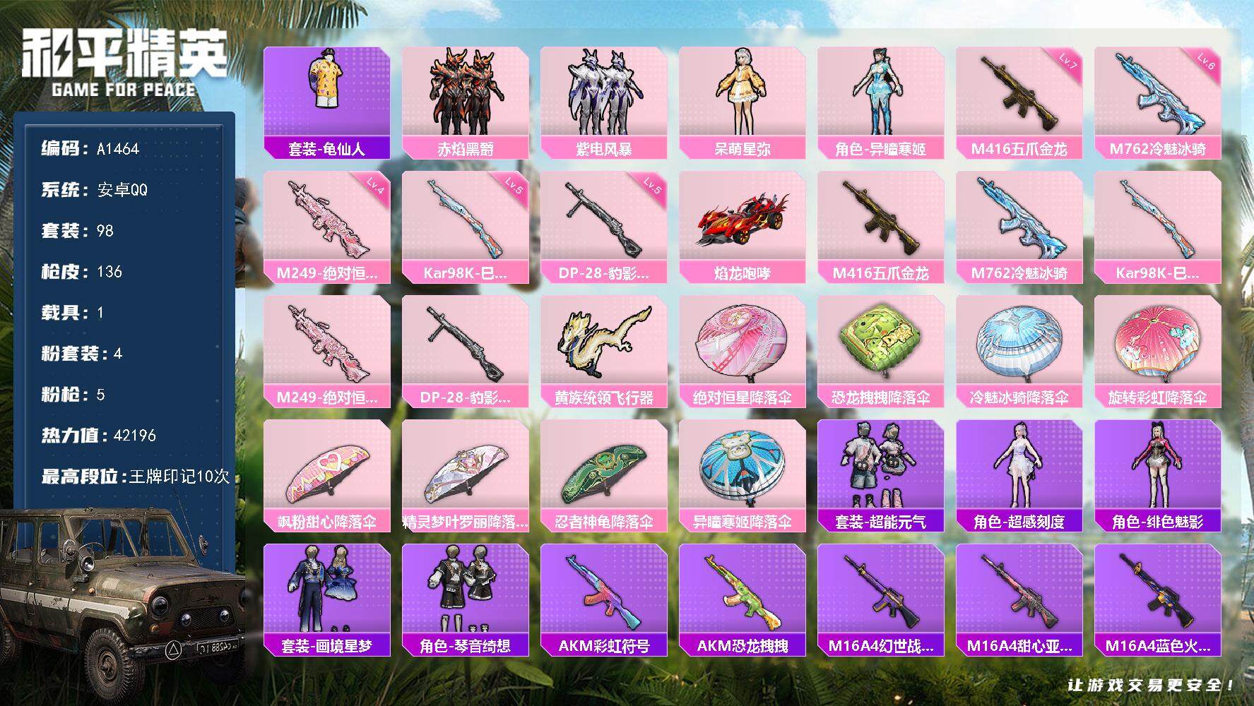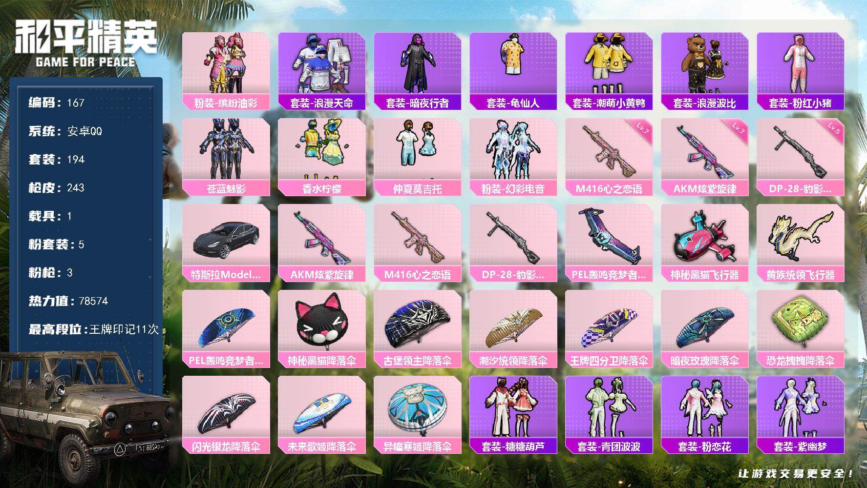 安卓Q-11王牌印记-5粉装-3特效枪-243枪皮-194套装-1载具