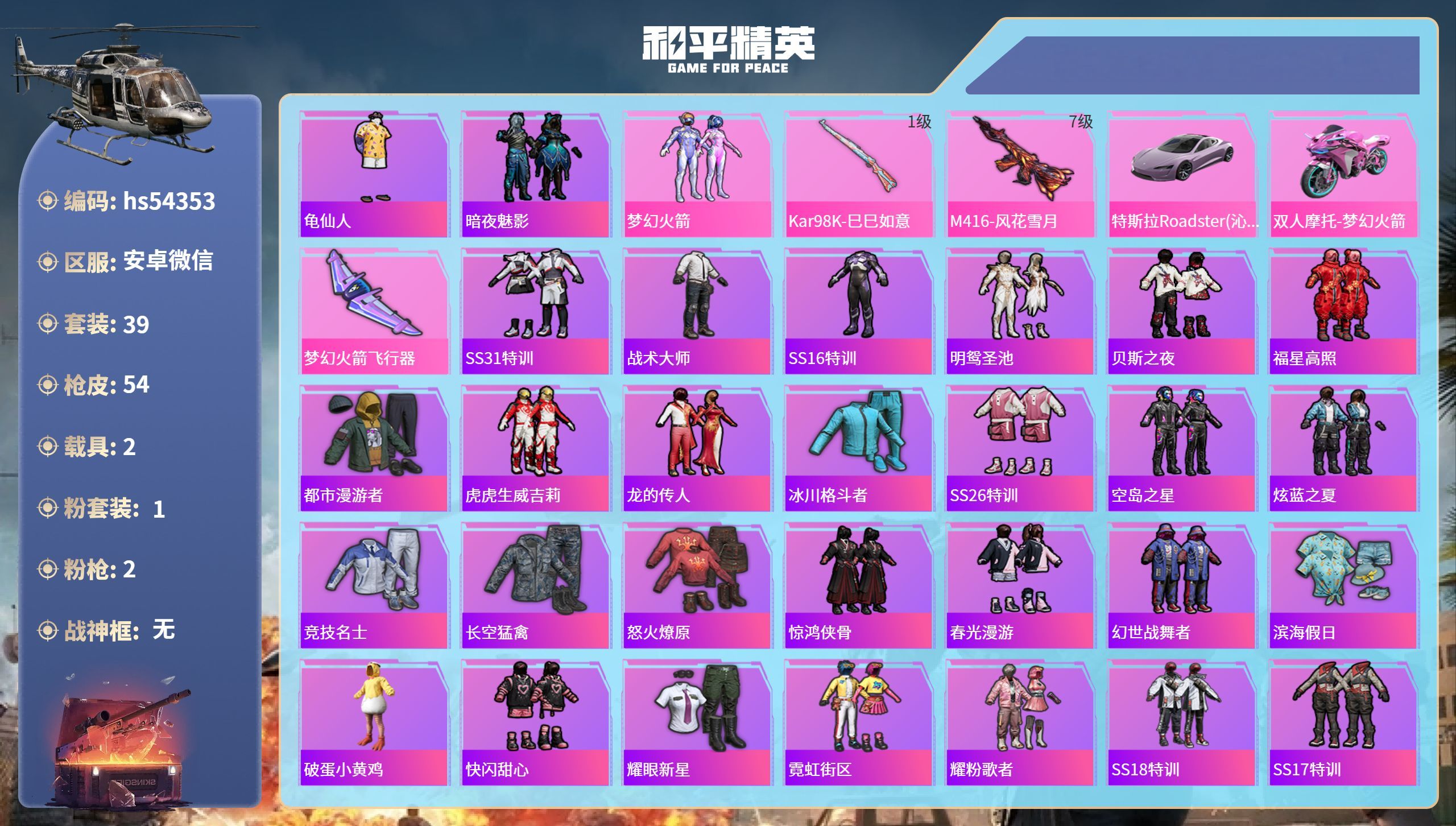 hs54353 安卓v-1王牌印记-1粉装-2特效枪-2载具-19478热力值-39套装-54枪皮