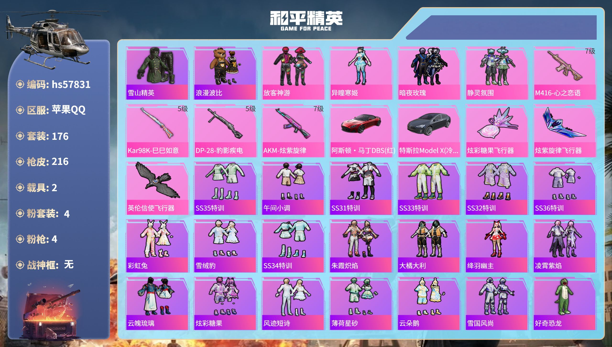 hs57831 苹果手Q-8王牌印记-4粉装-4特效枪-2载具-67475热力值-176套装-216
