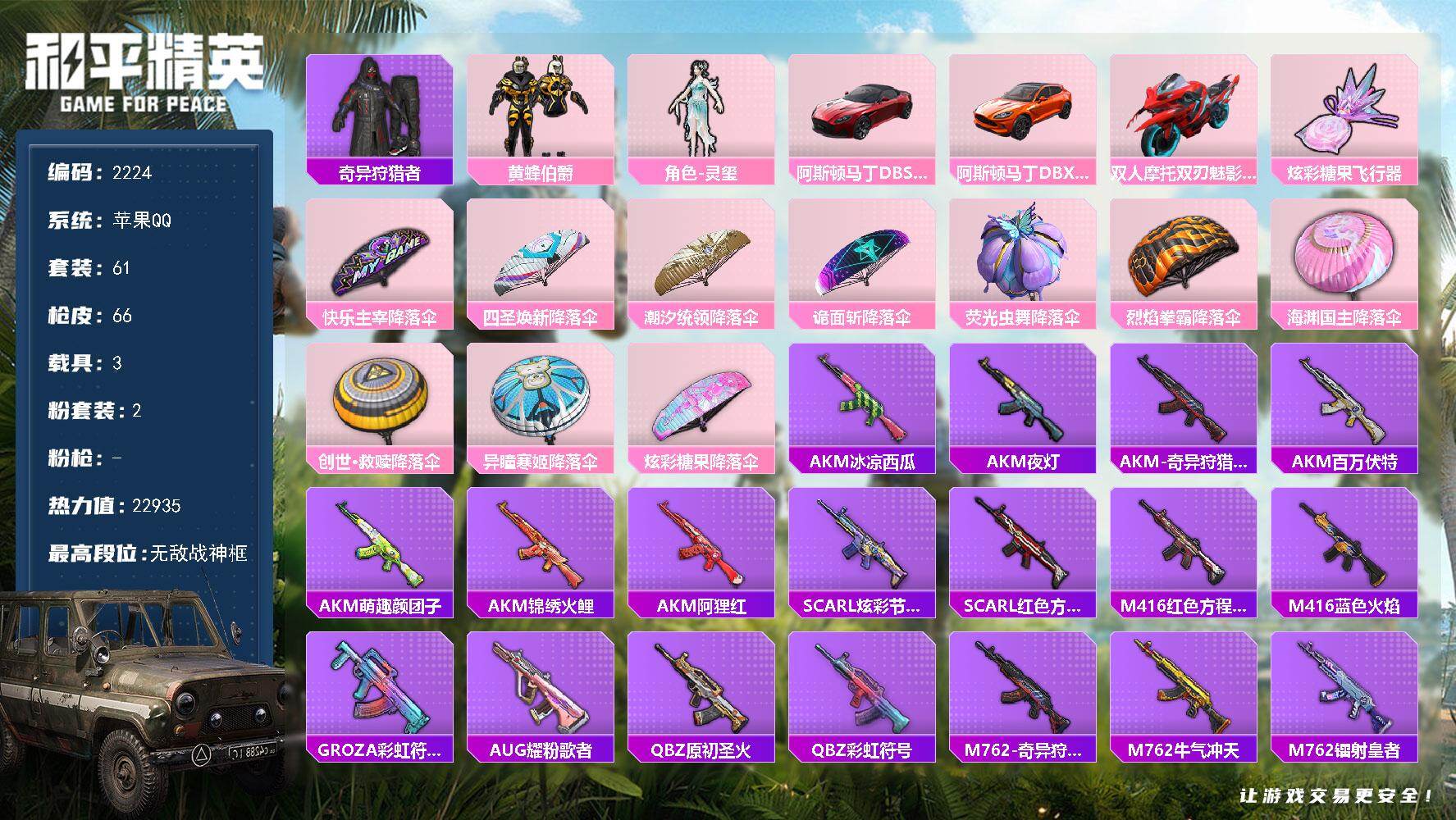 a4018/安卓QQ/热力值:20157,3粉装,4粉枪,1载具,8粉色战备,32套装,69枪械,7