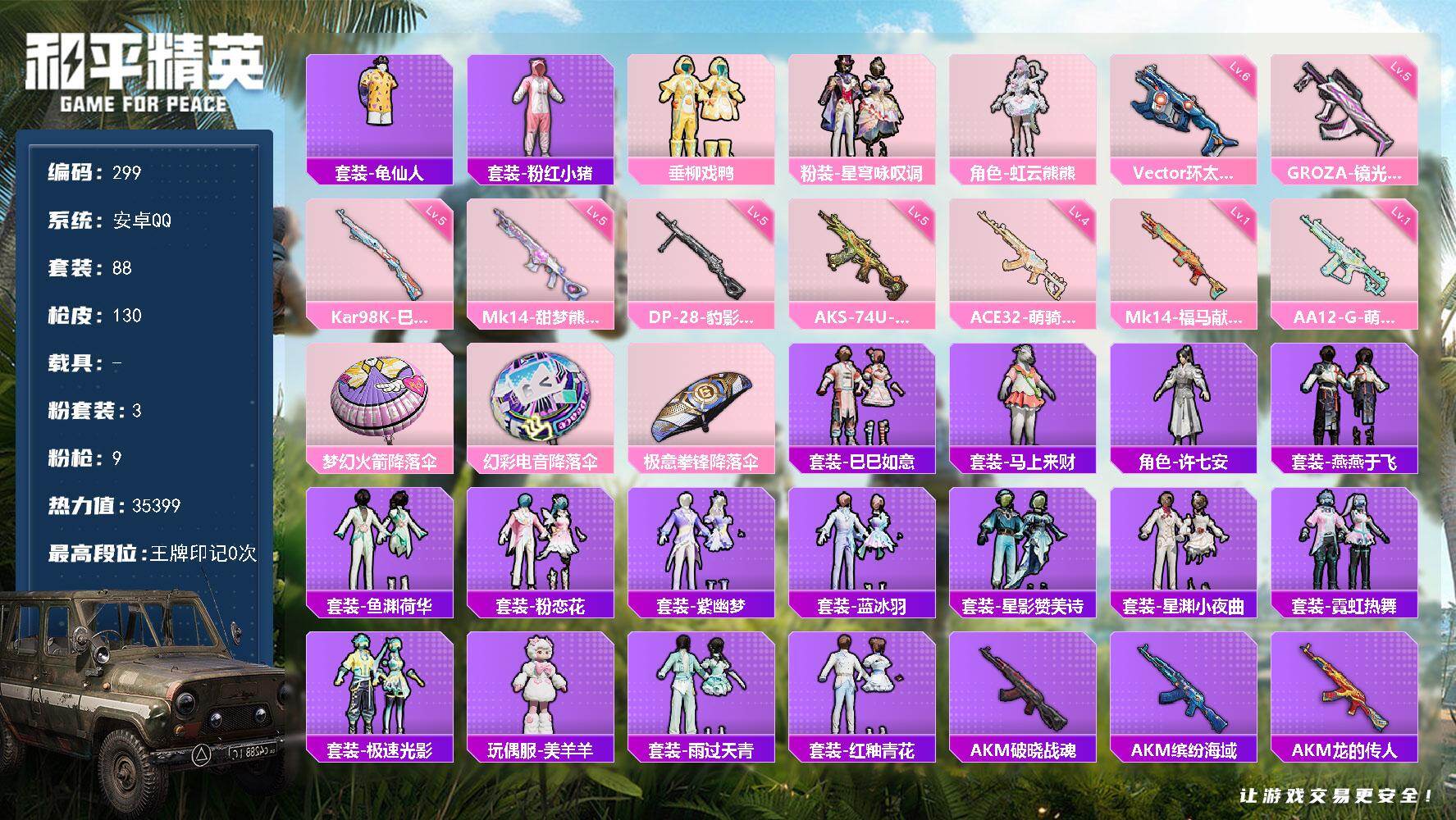 安卓 手Q-3粉装-9特效枪-0载具-0粉色飞行器-35399热力值-