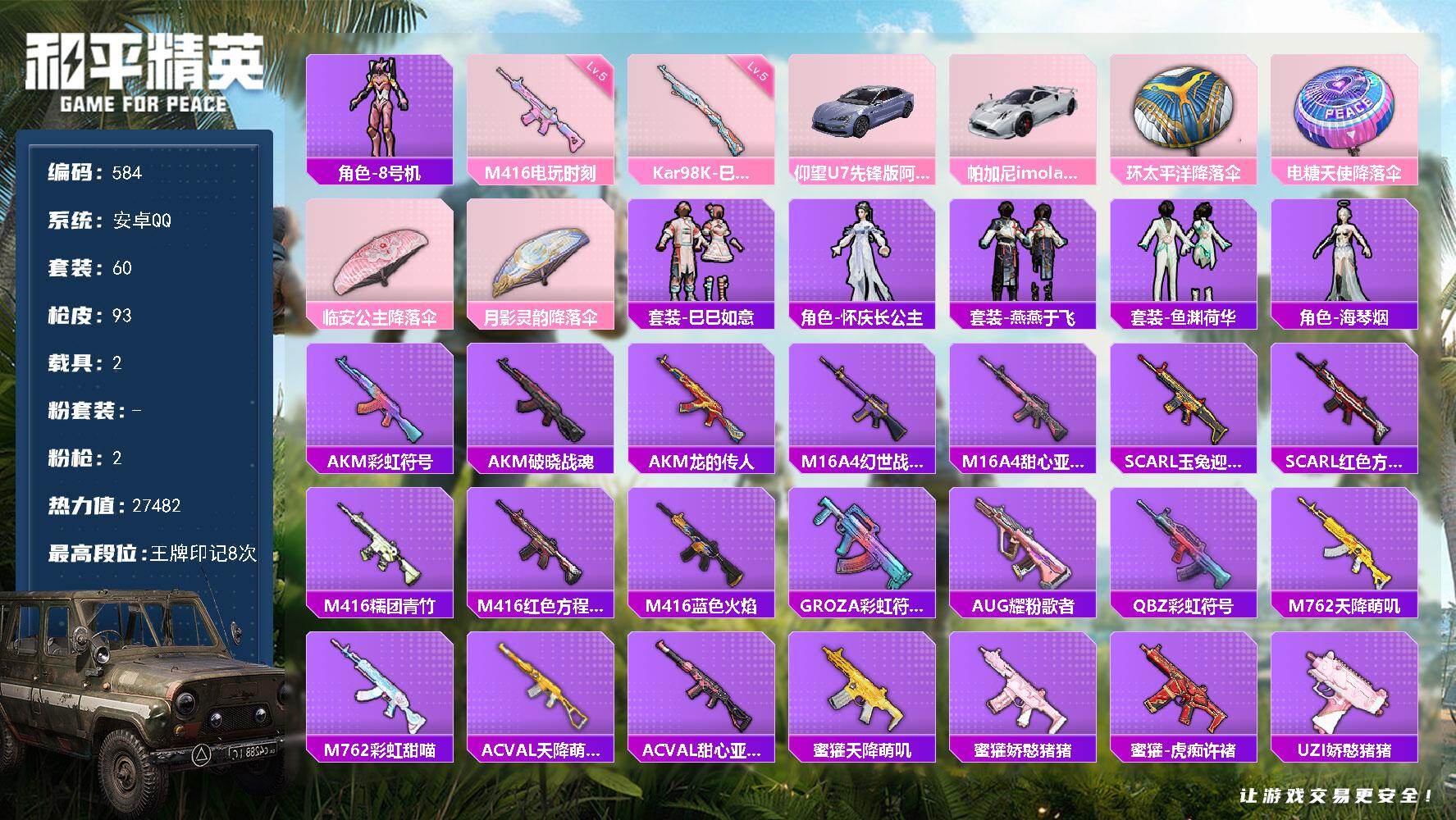 安卓 手Q-0粉装-2特效枪-2载具-0粉色飞行器-27482热力值-8王牌印