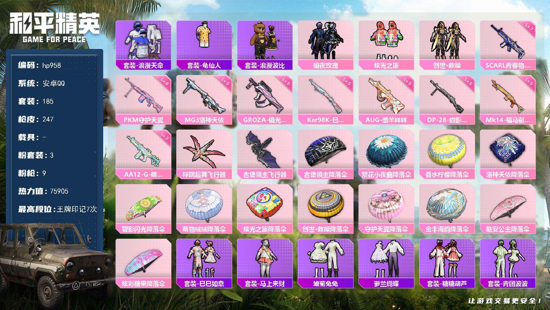 安卓 手Q-3粉装-9特效枪-0载具-2粉色飞行器-75905热力值-7王牌印