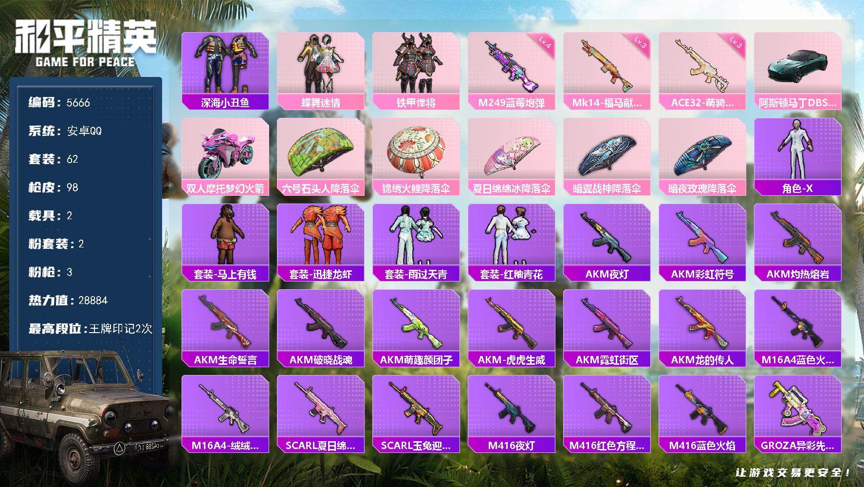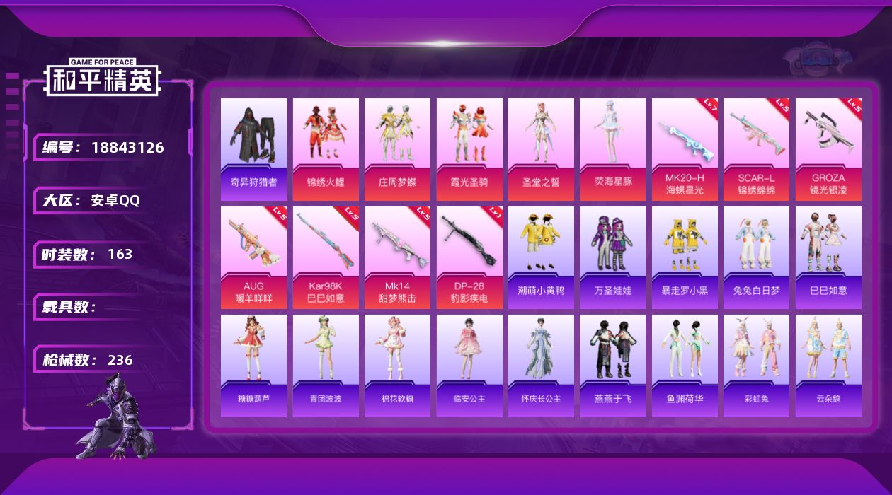 安卓 手Q-3粉装-7特效枪-1载具-1粉色飞行器-25029热力值-3王牌印