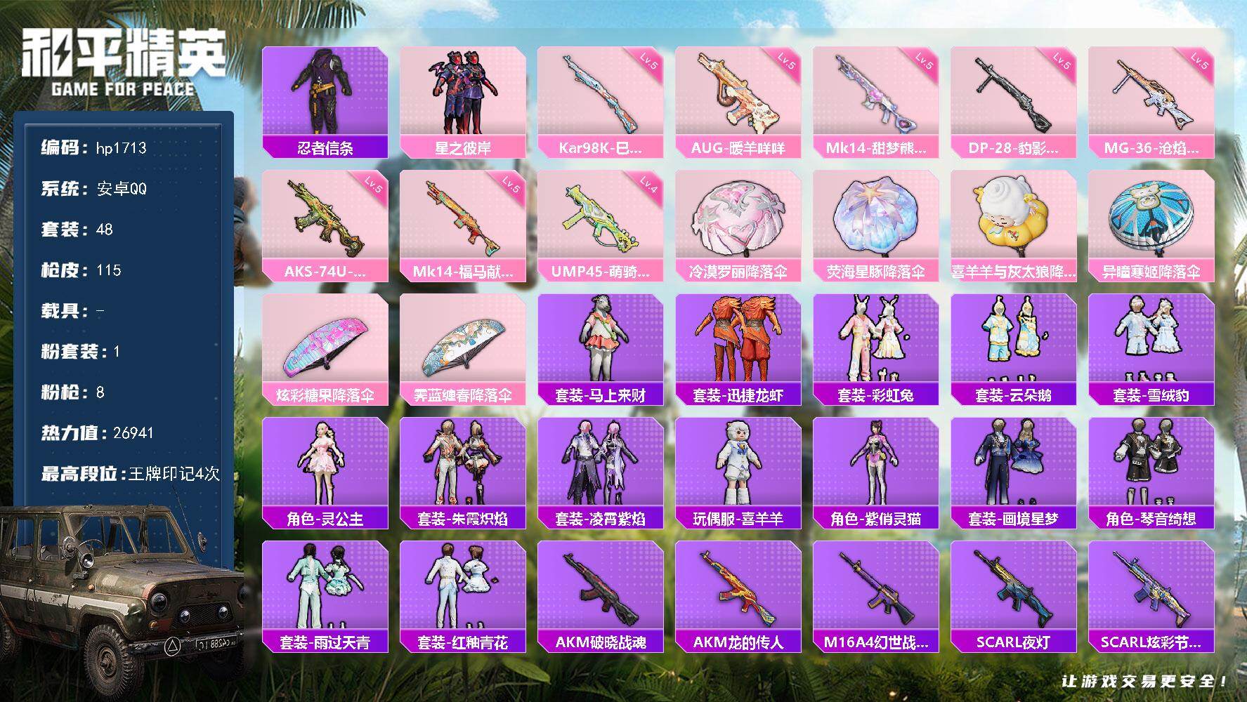 安卓 手Q-1粉装-8特效枪-0载具-0粉色飞行器-26941热力值-4王牌印记