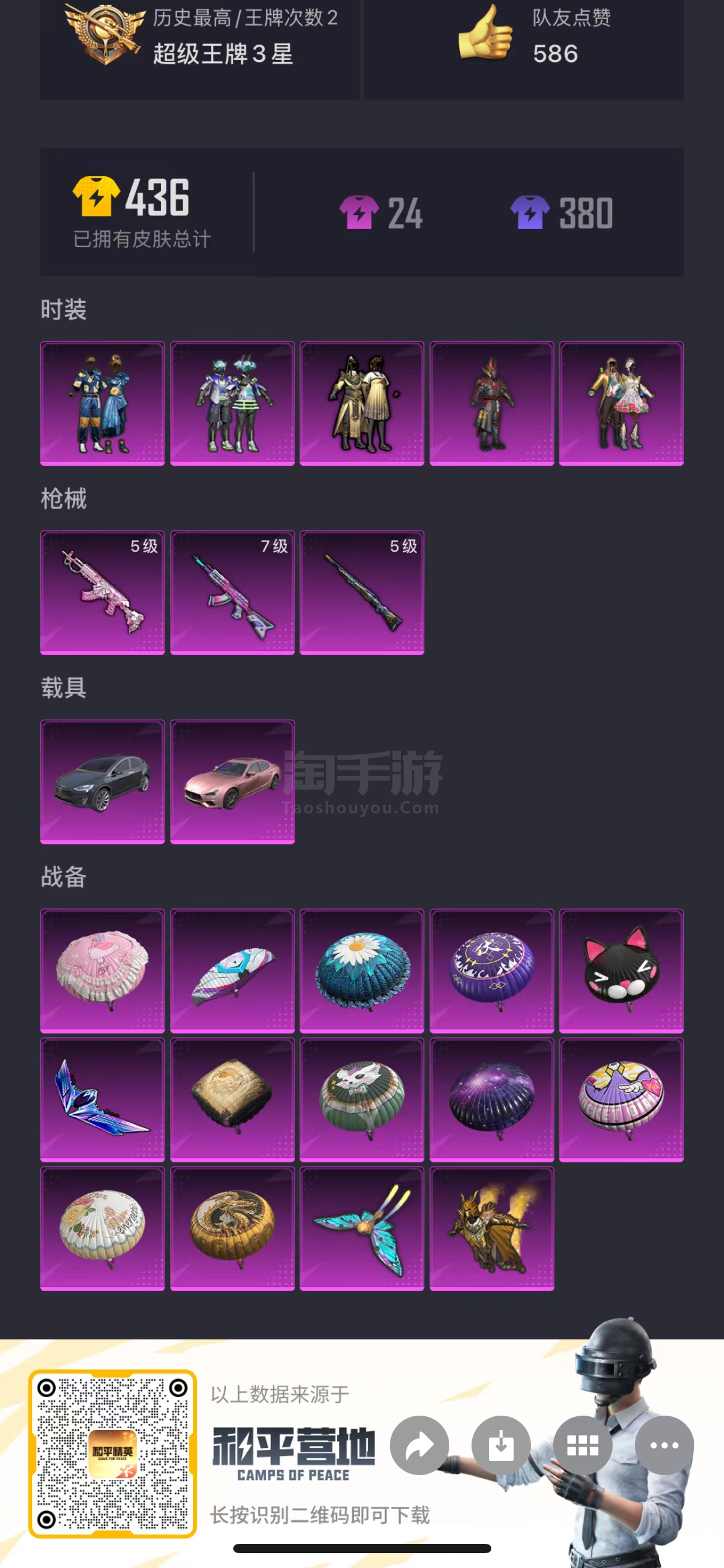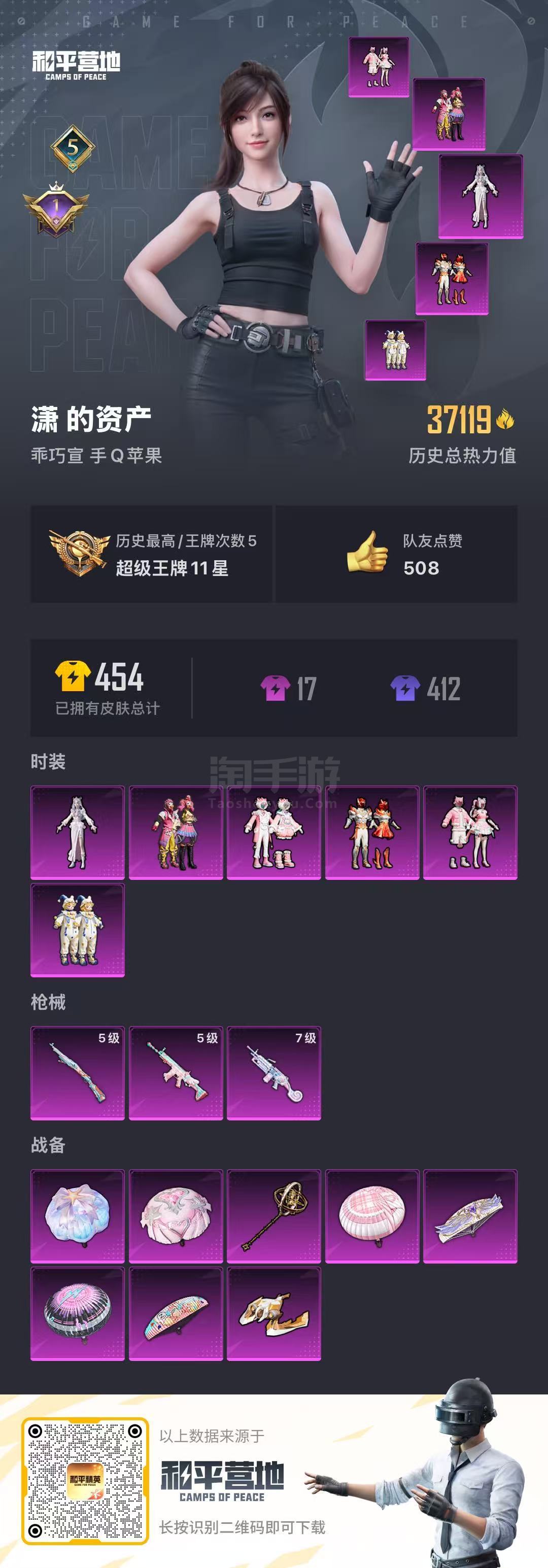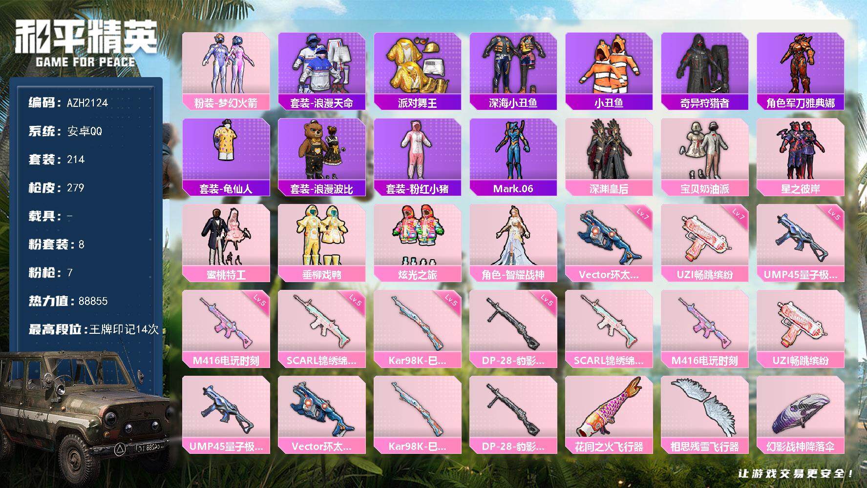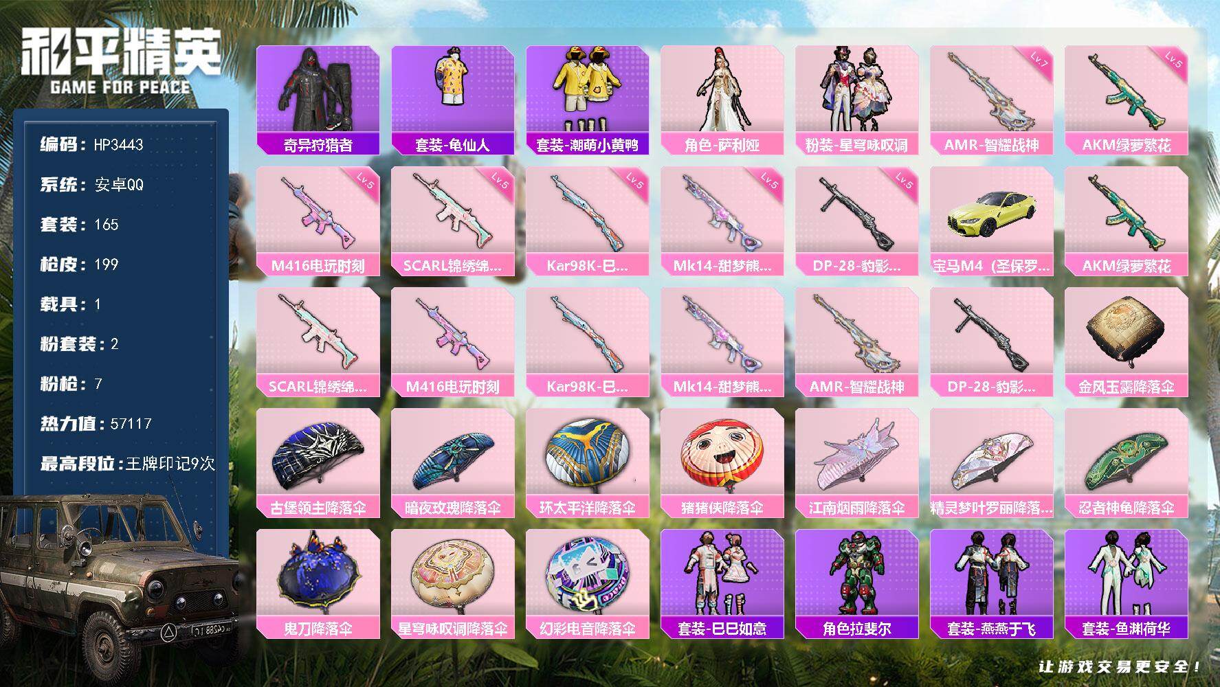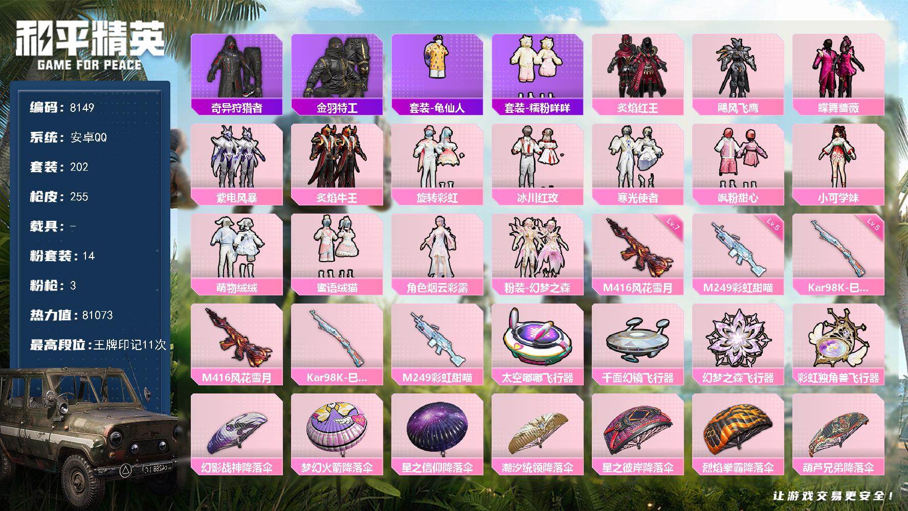 a3849/苹果QQ-11王牌印记-4粉装-2特效枪-1载具-45765热力值-92套装-149枪皮