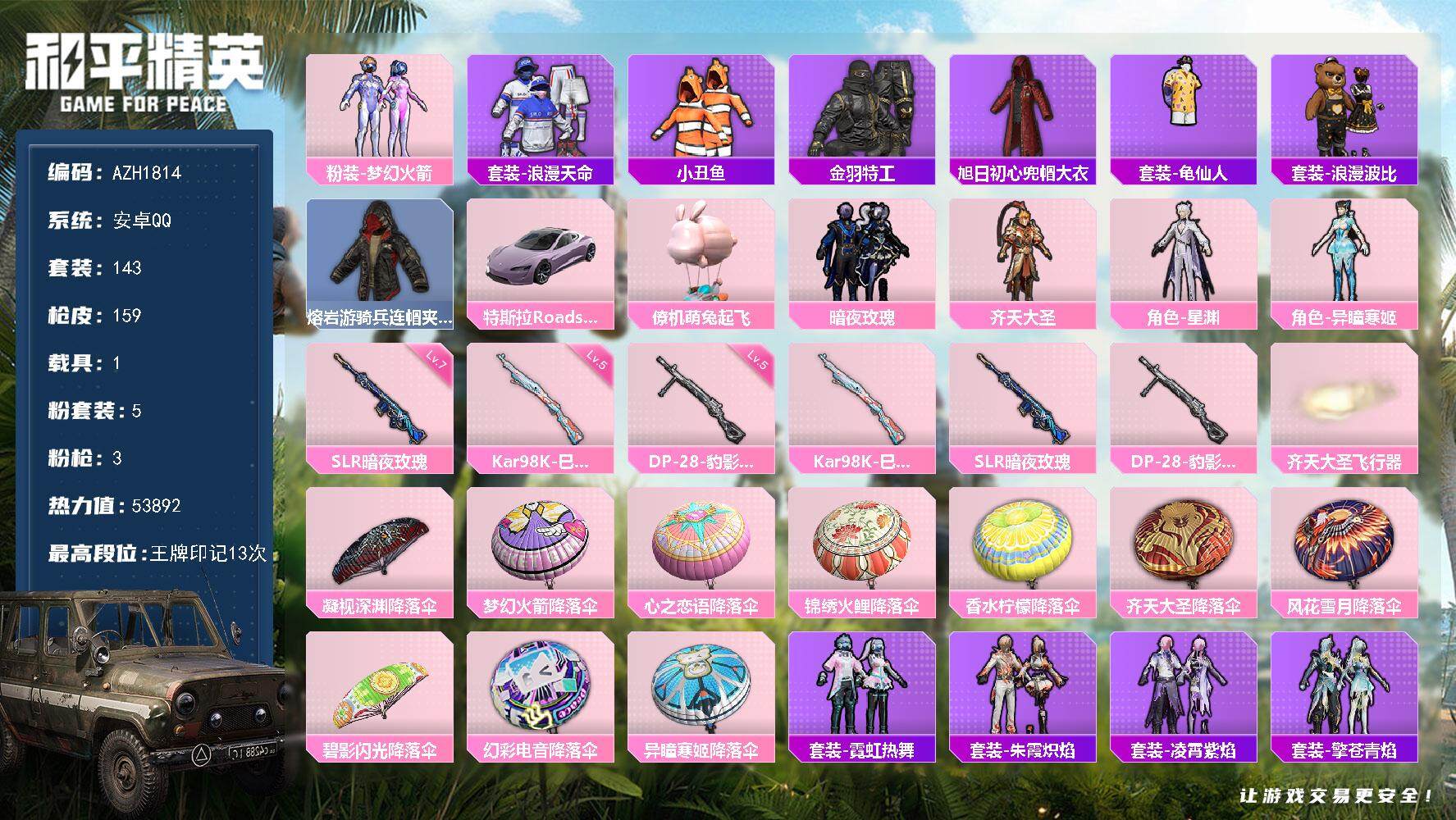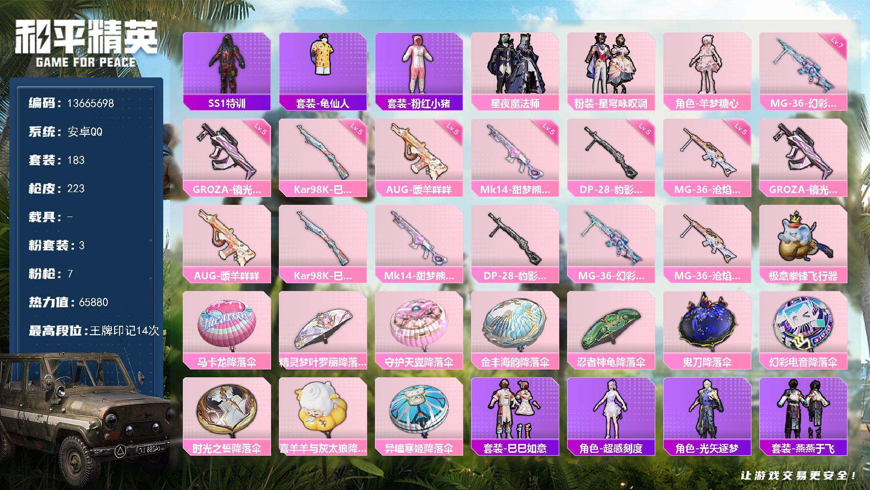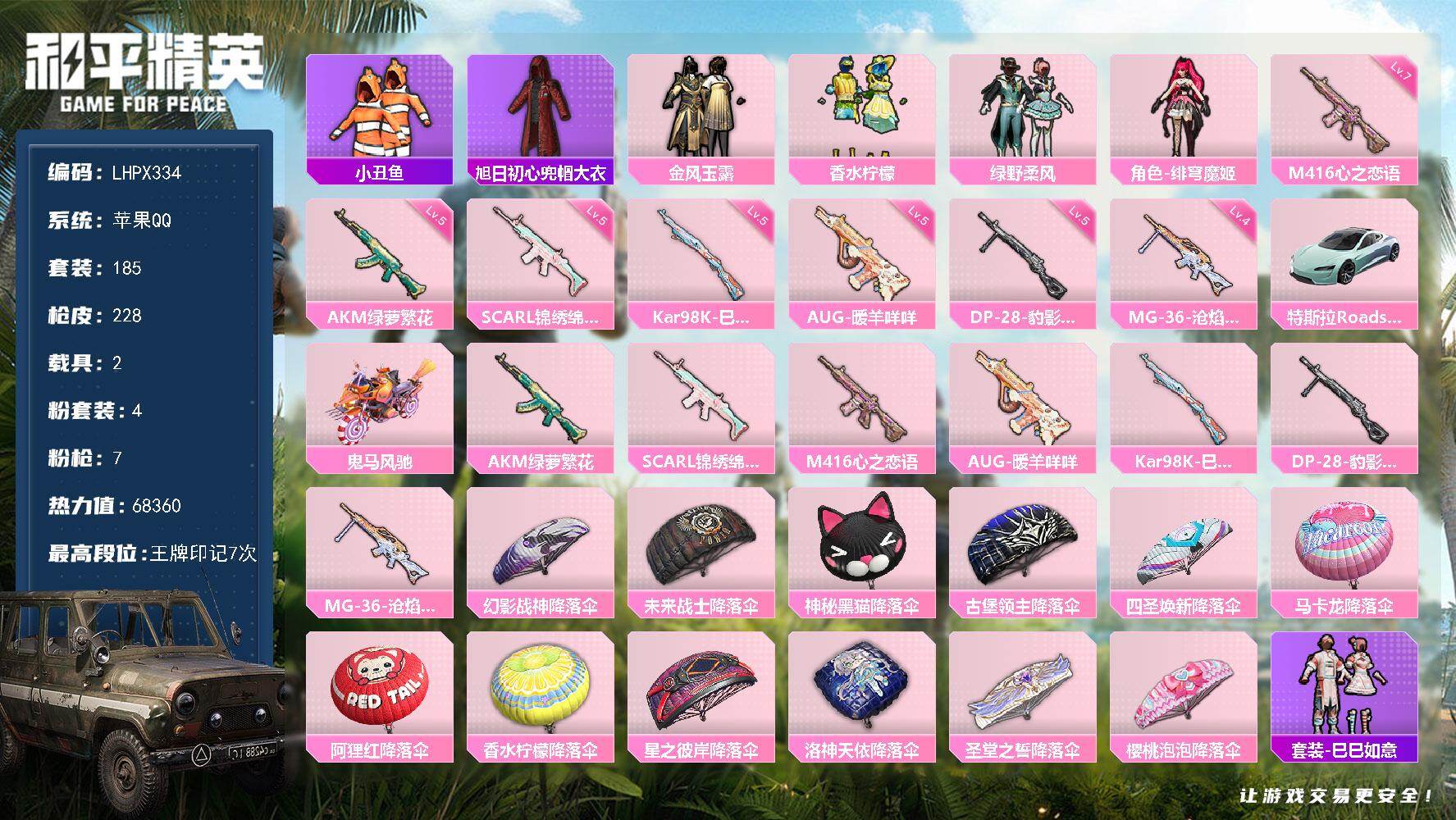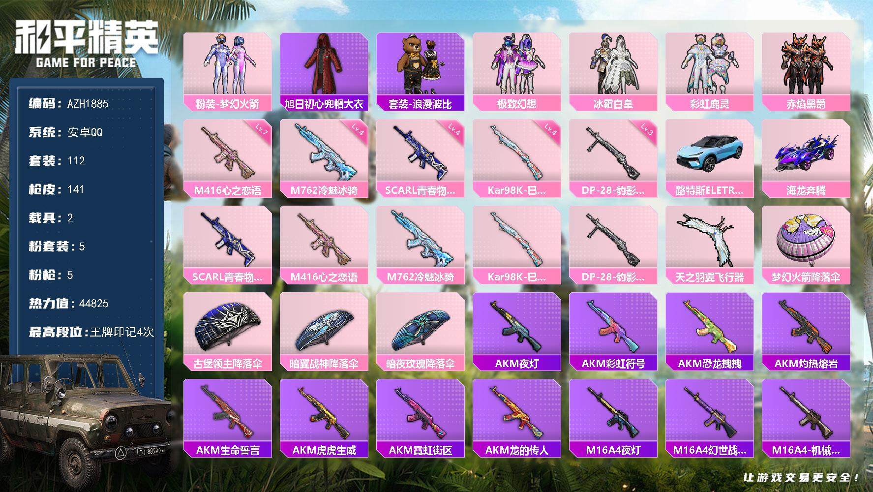 hs54374 苹果手Q-4王牌印记-2粉装-5特效枪-1载具-35360热力值-80套装-114枪