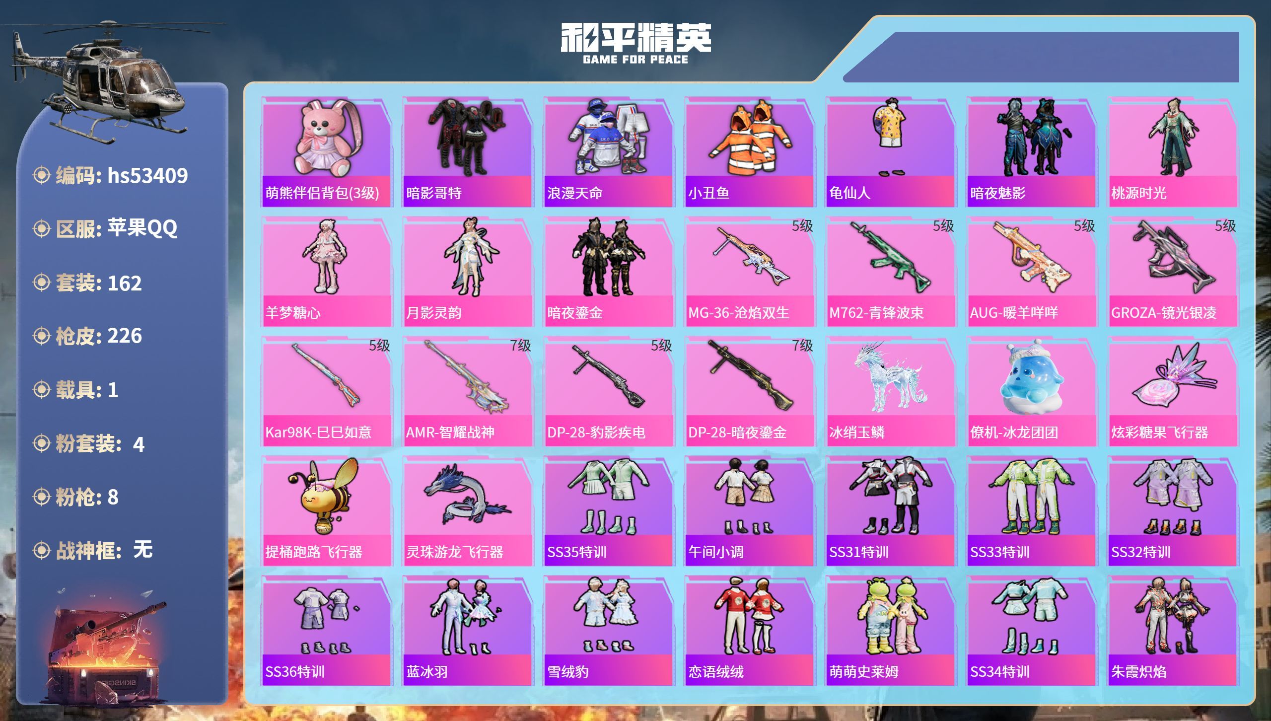 hs53409 苹果手Q-14王牌印记-4粉装-8特效枪-1载具-66883热力值-162套装-22