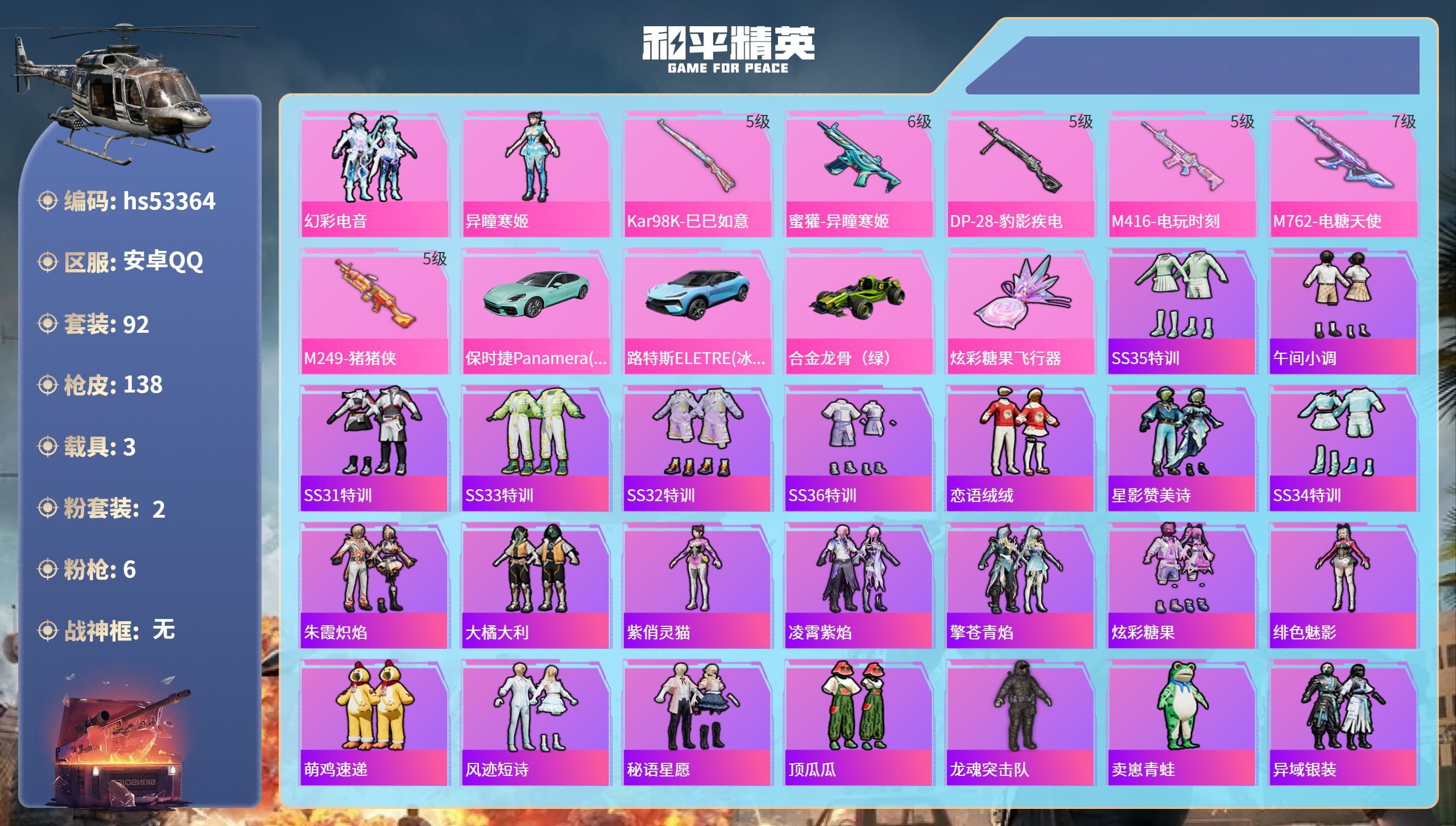 hs53364 安卓手Q-9王牌印记-2粉装-6特效枪-3载具-41350热力值-92套装-138枪