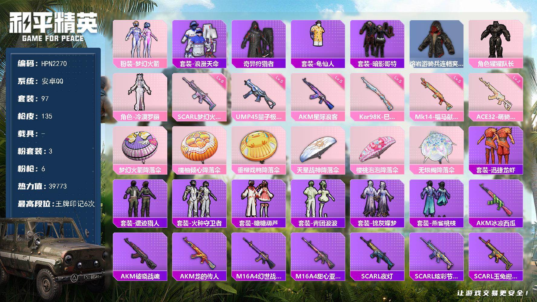 安卓 手Q-3粉装-6特效枪-0载具-0粉色飞行器-39773热力值-6王牌印记