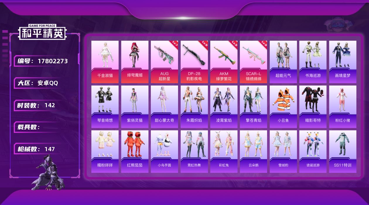 实名: 可修改 时装数: 668 枪械数: 245 战备数: 184 热门装扮