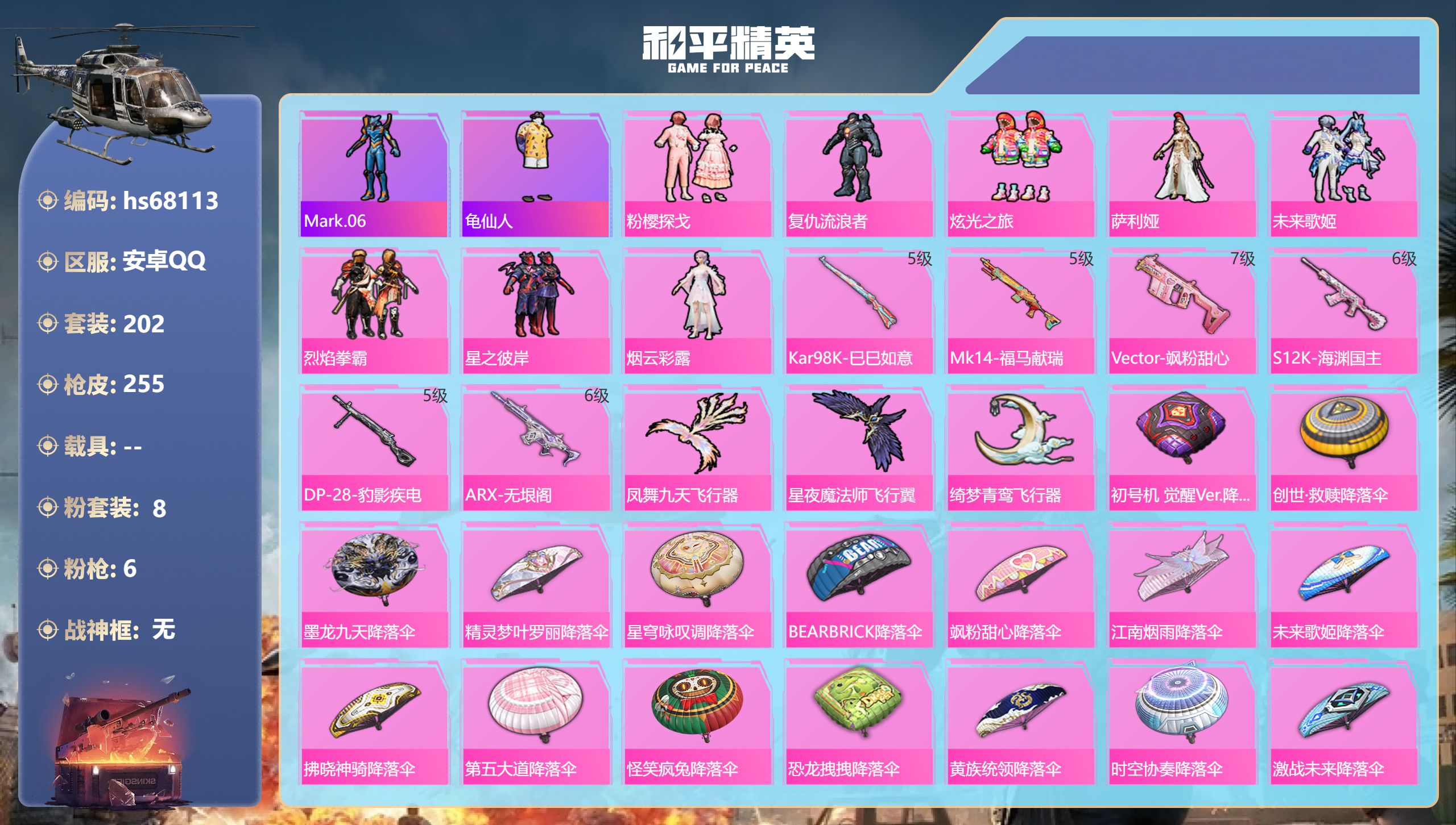 安卓 手Q-6粉装-9特效枪-0载具-2粉色飞行器-59089热力值-4王牌印