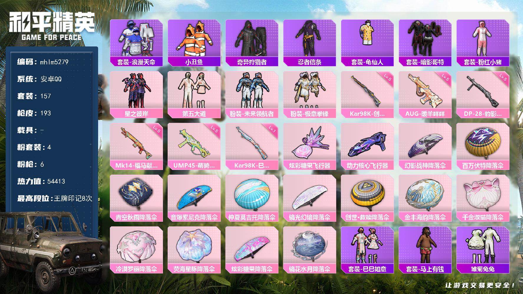 4粉装-6特效枪-0载具-2粉色飞行器-54413热力值-8王牌印记-157套装-193枪皮