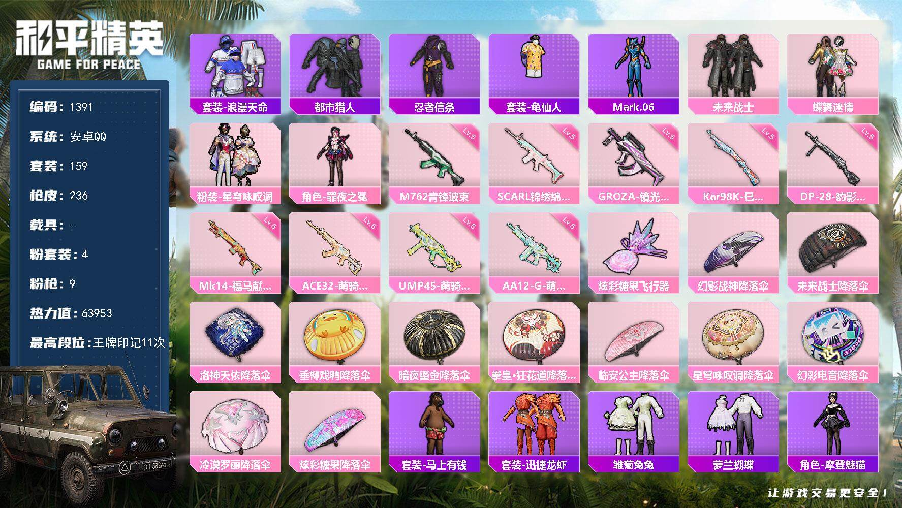 安卓 手Q-6粉装-9特效枪-0载具-2粉色飞行器-63517热力值-6王牌印记
