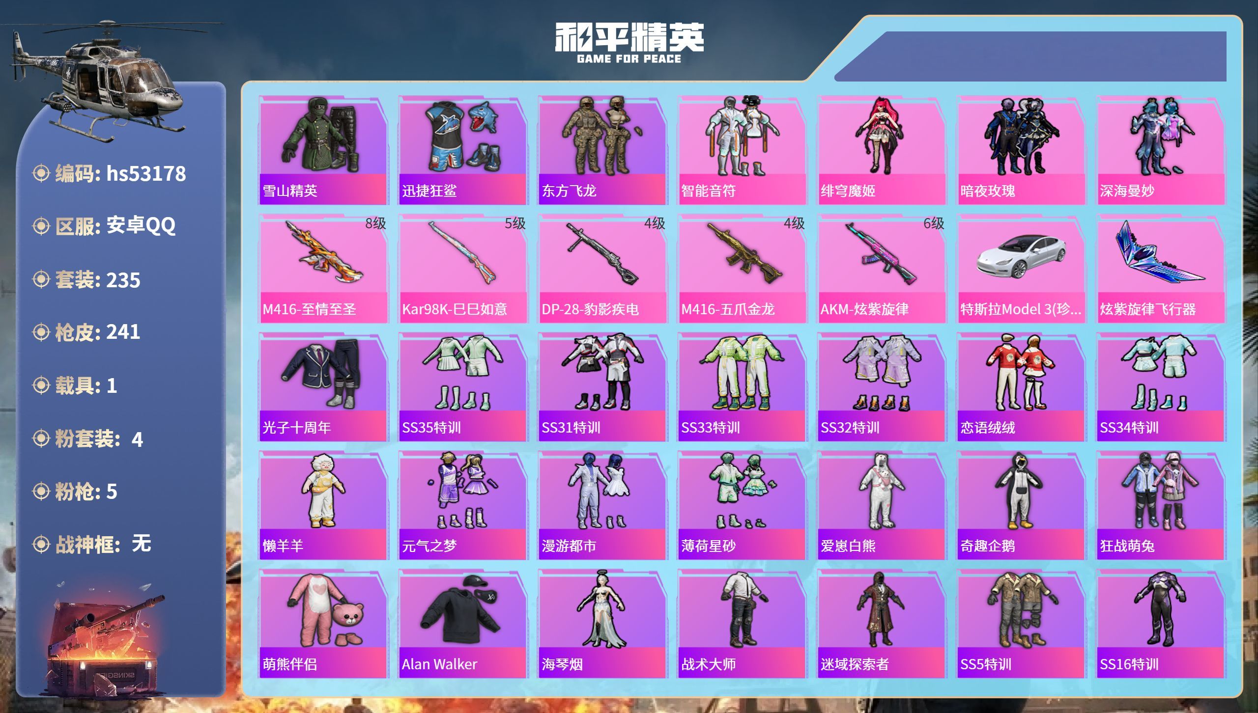 hs53178 安卓手Q-12王牌印记-4粉装-5特效枪-1载具-78960热力值-235套装-24
