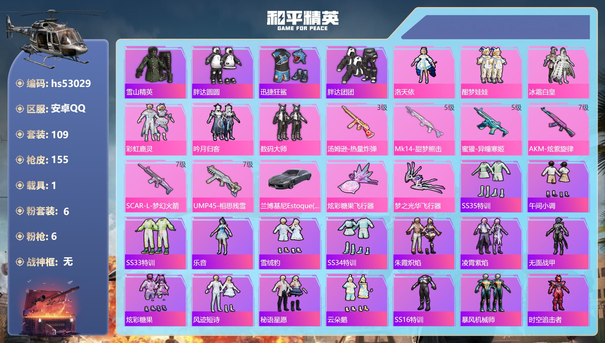 hs53029 安卓手Q-8王牌印记-6粉装-6特效枪-1载具-54554热力值-109套装-155